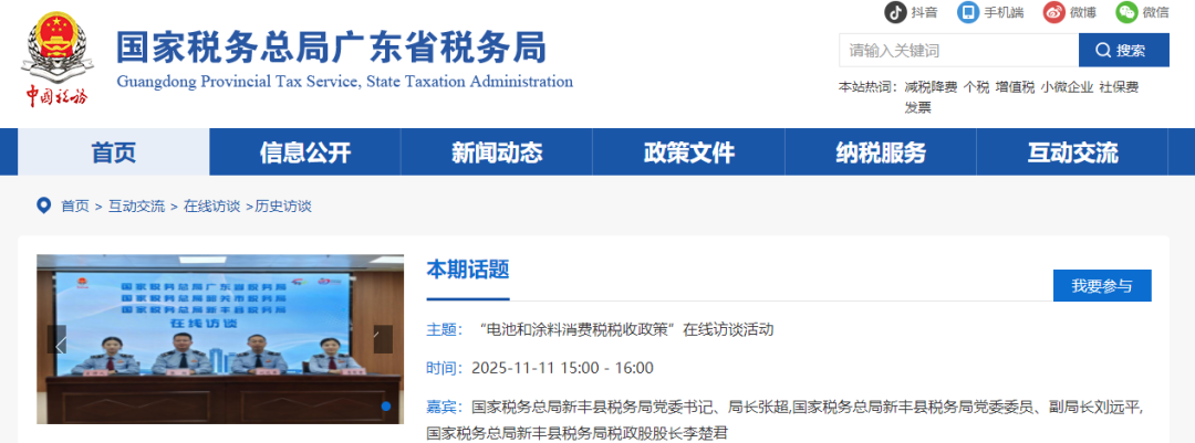 近日,国家税务总局广东省税务局举办了“电池和涂料消费税税收政策”在线访谈活动。嘉宾包括,国家税务总局新丰县税务局党委书记、局长张超,国家税务总局新丰县税务局党委委员、副局长刘远平,国家税务总局新丰县税务局税政股股长李楚君。