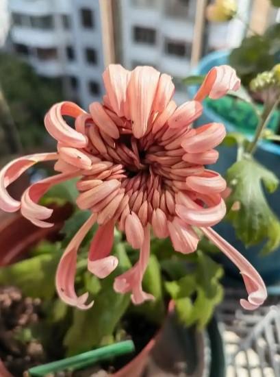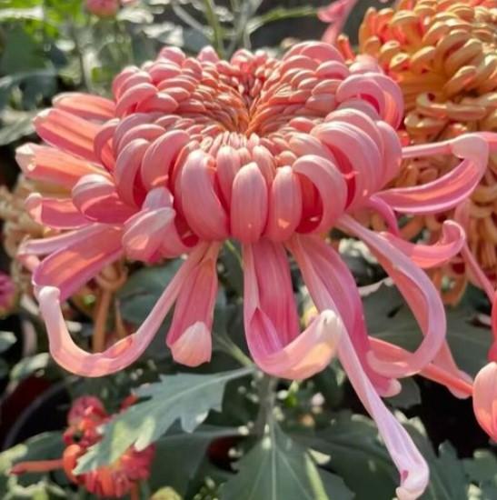 沉香台菊花是重瓣型国菊,花瓣层层叠叠,初开橘粉色,后期粉白色,非常明媚的颜色,花型饱满,花瓣层层叠叠,经典的菊花品种。 沉香台菊花绽放后呈现出漂亮的肉粉色,这种颜色在菊花中较为少见,花型规整层叠,观赏价值很高,株高60-80厘米,有沁人菊香,花语为沉静、雅致。