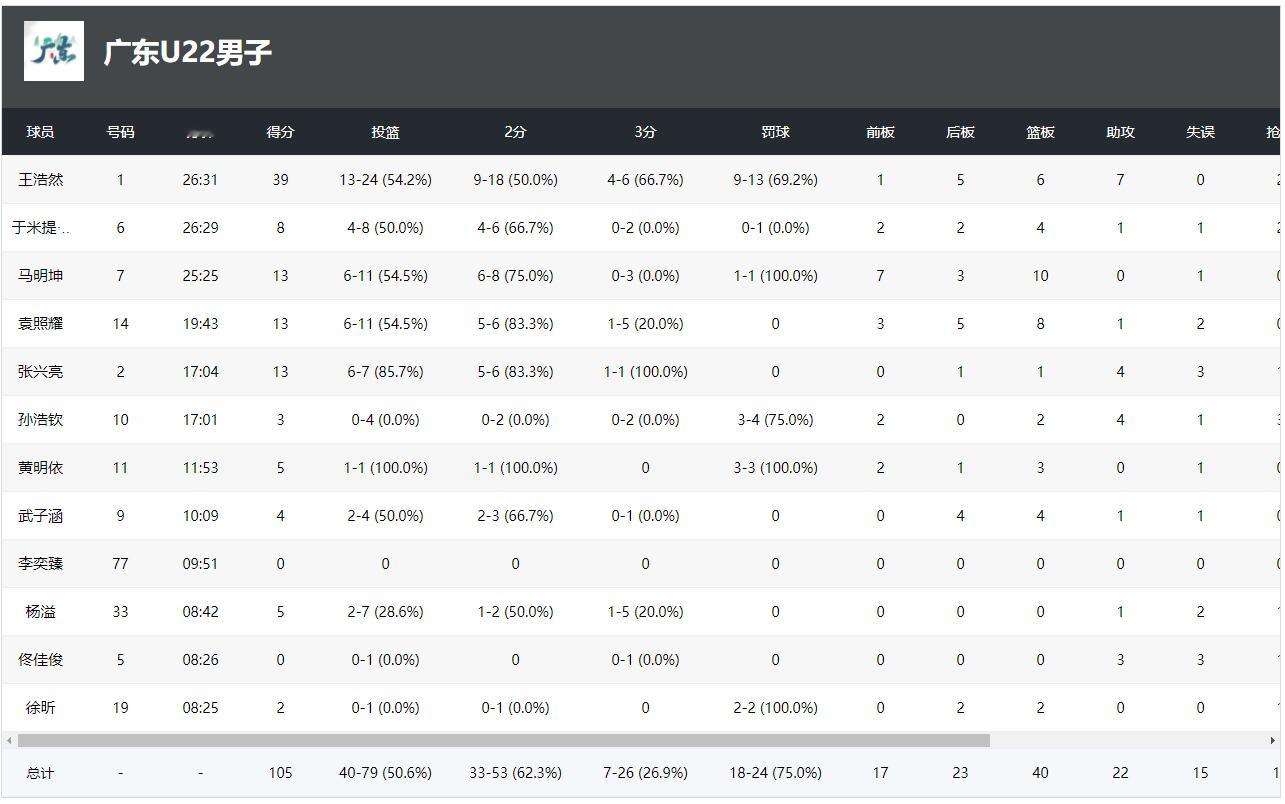 全运会U22男子篮球小组赛,广东U22男篮以102-75战胜天津U22男篮。广东U22男篮4人得分上双,王浩然拿下39分6篮板7助攻,马明坤13分10篮板,袁照耀13分8篮板,张兴亮13分4助攻