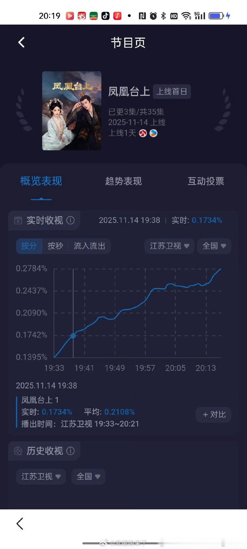 任嘉伦权威《凤凰台上》江苏卫视首播一集,收视率直接起飞,江苏卫视直接爬到了第四!平时都是飞榜的状态