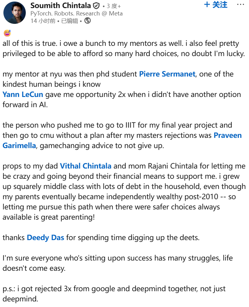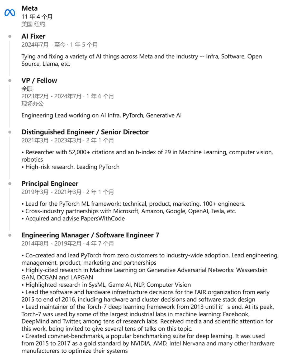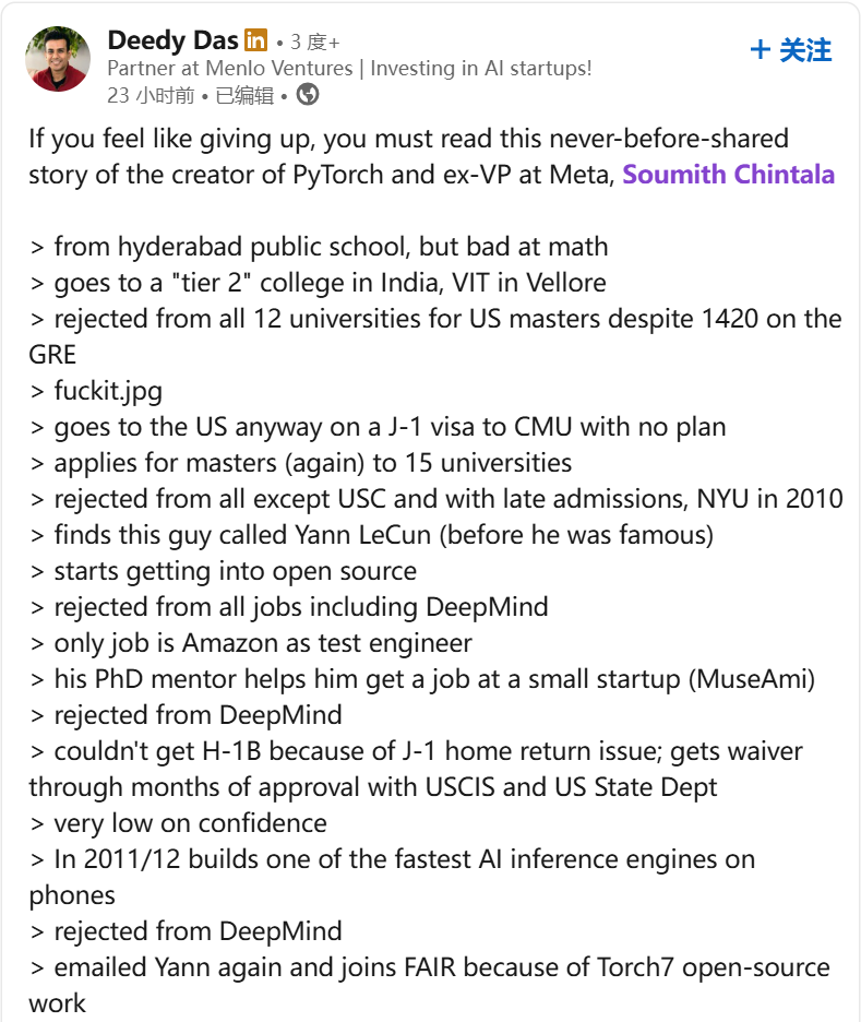通过这段经历,我们不难发现在整整12年(2005–2017)的失败、碰壁和反复挣扎之后,Soumith最终成为Meta的副总裁,成为AI领域最具影响力的人之一!