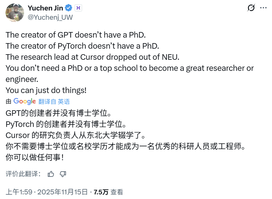 不仅对于AI,还是很多其他领域来说,热情、自主性、品味和韧性往往比学校的名气更重要。