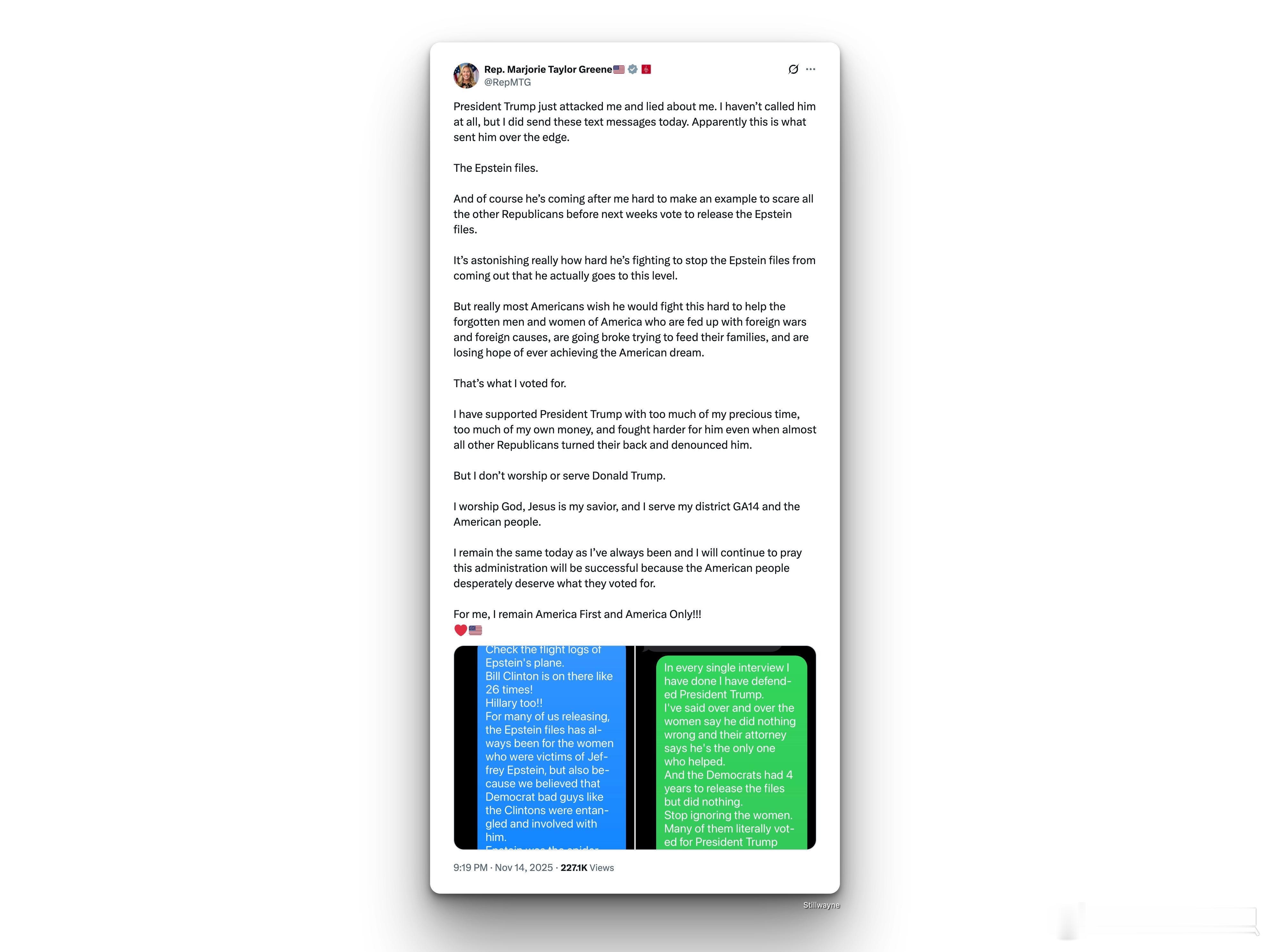 玛乔丽·泰勒·格林反击特朗普的指责:他攻击我就是因为我要求公开爱泼斯坦档案--------------------特朗普总统刚刚攻击了我,还撒了谎。我根本没有给他打过电话,我只是今天发了几条短信给他。显然,就是这些短信把他气炸了。短信的内容是 关于爱泼斯坦档案。很明显,他现在这么猛烈地冲我开火,就是想“杀鸡给猴看”,吓唬其他共和党人,因为下周国会就要投票是否公开爱泼斯坦档案。说实话,他为了阻止“爱泼斯坦档案”公开,居然能做到这种程度,真的令人震惊。但很多美国人其实希望,他能把这种劲头,用在帮助那些真正被遗忘的美国人身上,那些厌倦了海外战争和外国事务、为了养家几乎被生活压垮、对美国梦越来越失望的人们。而这才是我当初投票支持他的原因。这些年,我为特朗普付出了太多时间、太多金钱,在全体共和党人几乎都转身抛弃他、谴责他的时候,我仍然拼命为他辩护、为他战斗。但是,我不崇拜也不侍奉唐纳德·特朗普。我敬拜上帝,耶稣是我的救主,我服务的是佐治亚州14选区的选民,以及美国人民。我今天的立场和过去一样不会改变。我会继续祈祷这个政府能成功,因为美国人民确实值得实现他们投票期望得到的东西。至于我本人,我仍然坚持,美国优先,美国至上!