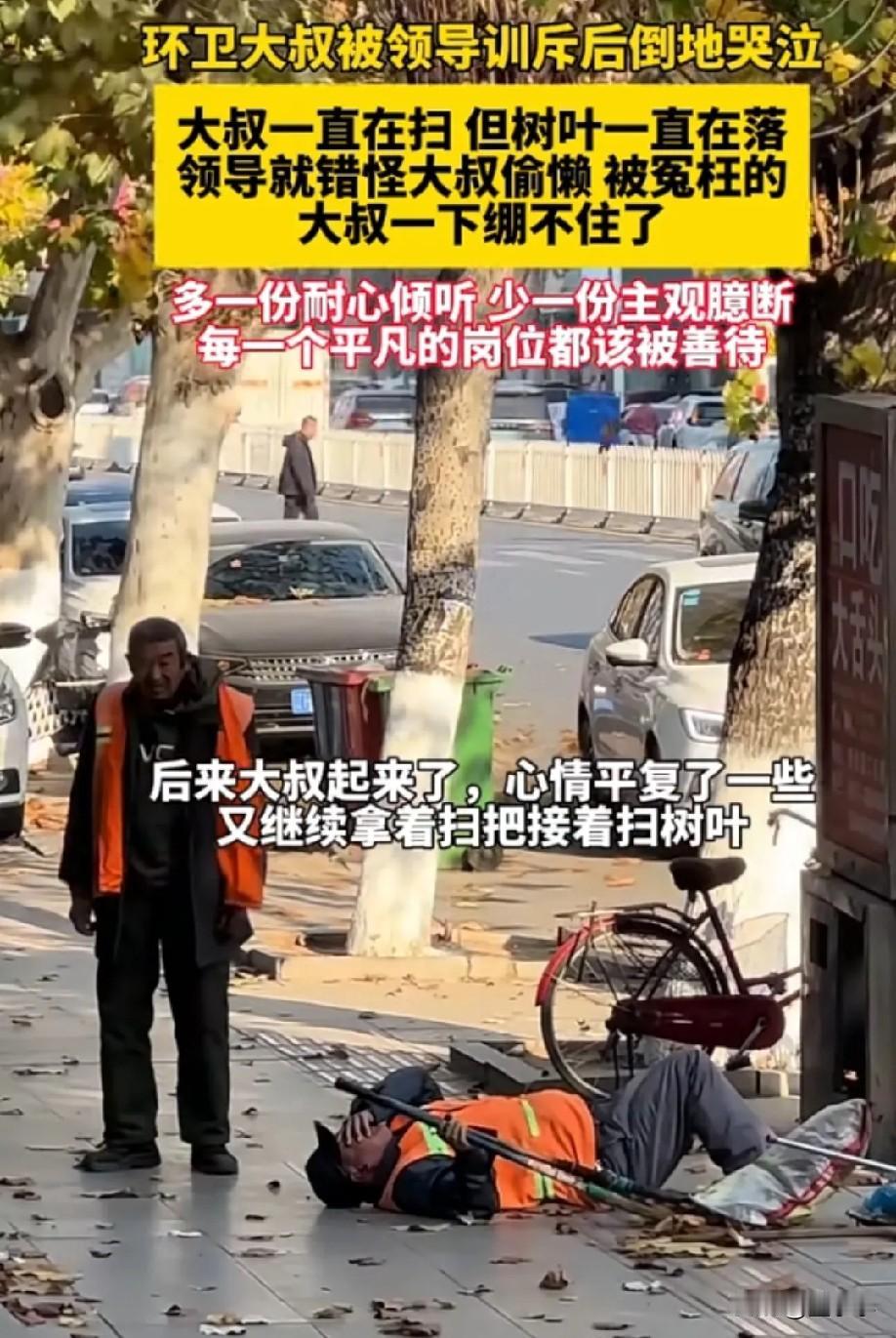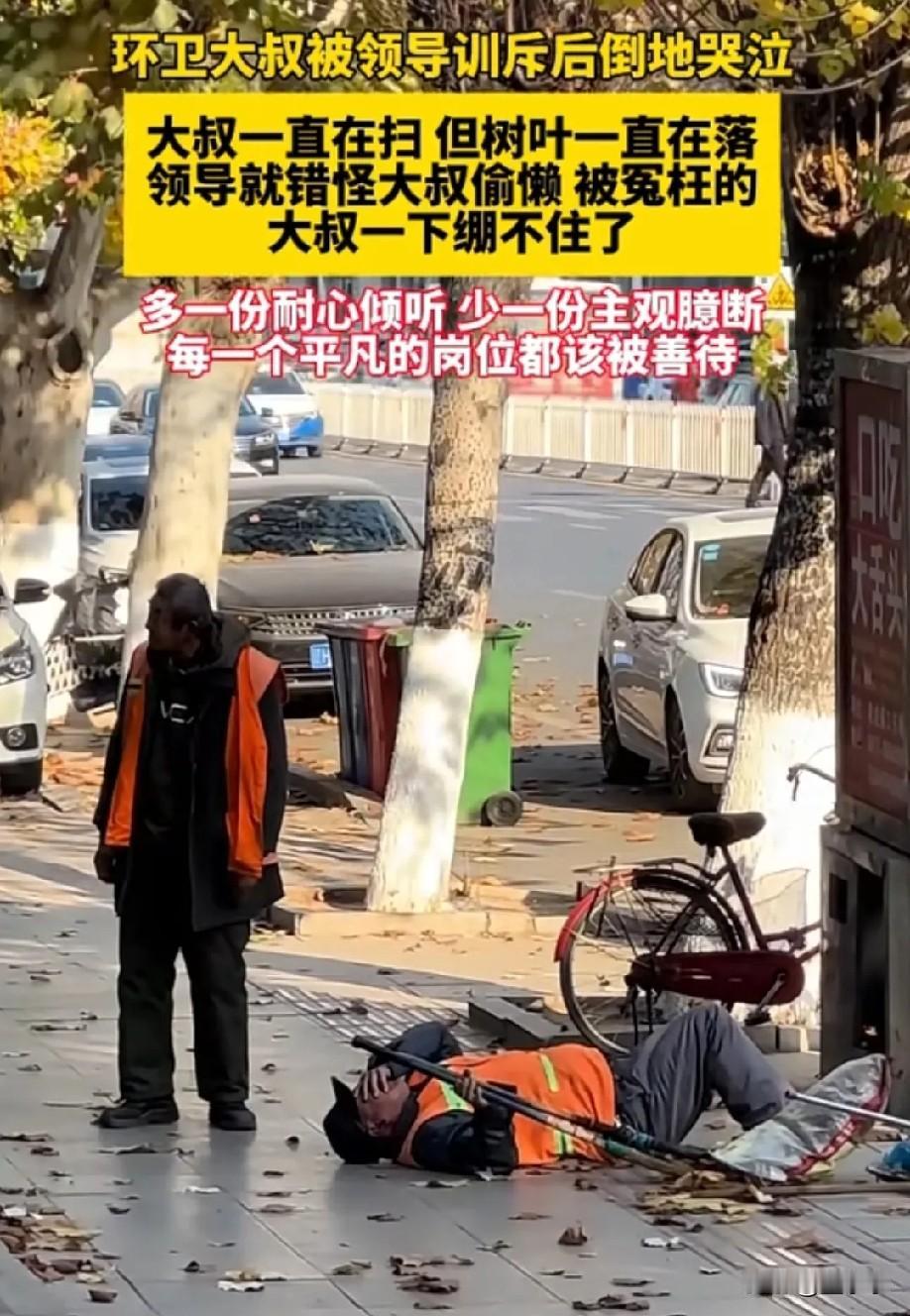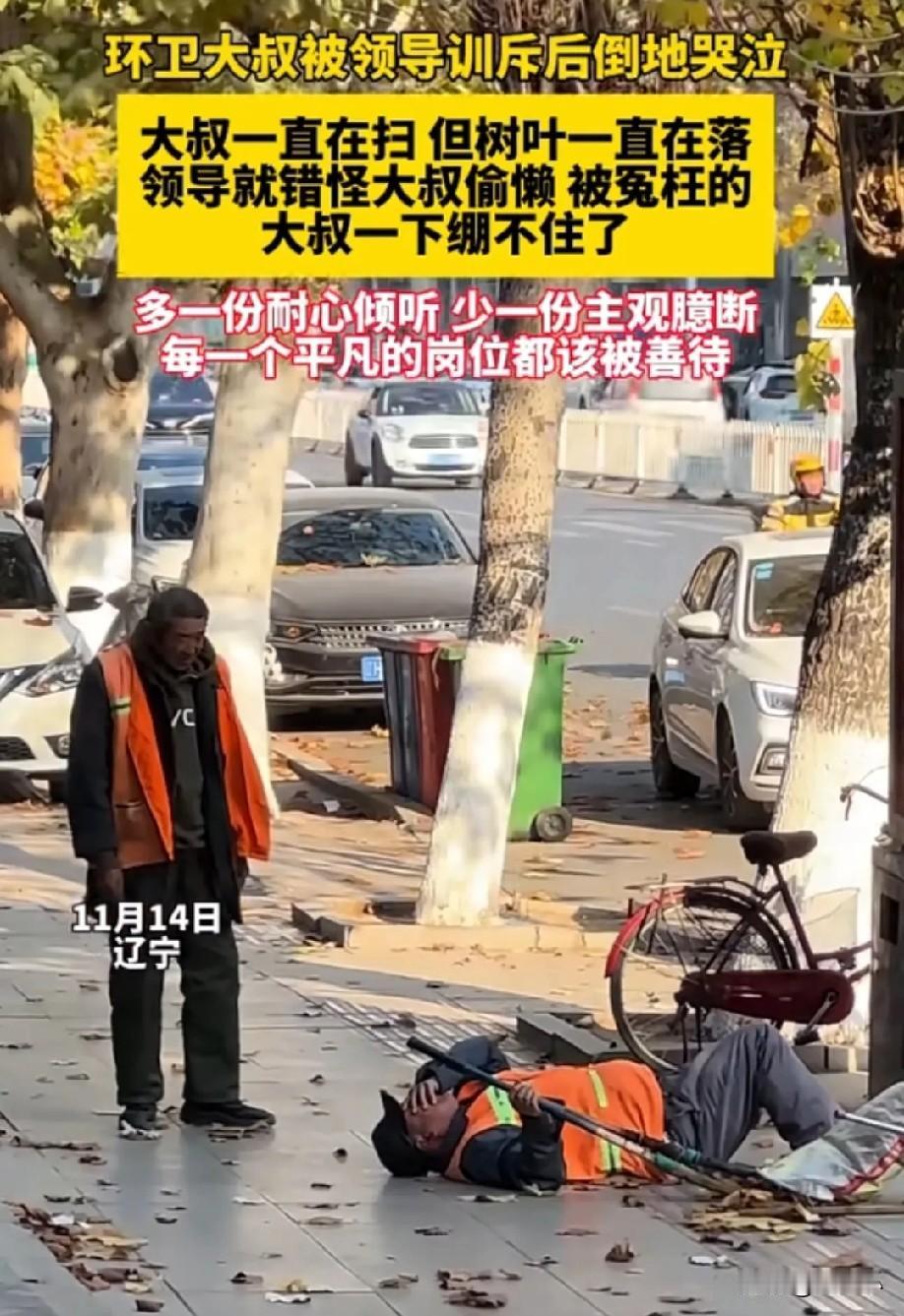 看哭了!辽宁,一位环卫工大爷躺在地上崩溃哭出声来,一旁的大爷无助又无奈,只好好生的安慰着。 原来秋季正是落叶的季节,大爷路边打扫,刚打扫风一吹,树叶又落了下来,正好被领导看到,以为大爷偷懒,就开始训斥起来。 大爷被训斥完后,一下子就绷不住了,躺在地上,一手握着扫把,一手掩面哭泣,一旁的大爷只能陪着,安慰着他。 看到这一幕真的心酸,还是多给点补贴吧,少点苛刻吧,因为我有次凌晨三点带孩子去医院,就看到街上有环卫工人打扫的身影。 尤其,是秋天的时候,看到他们刚装完路边一袋一袋的树叶,后面又开始落了下来。