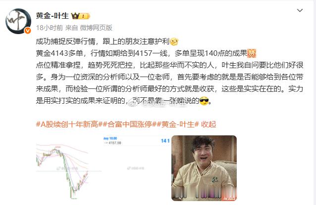 昨日战绩总结共拿下510点 【13连胜】第一单:黄金4184多单,离场4196,拿下120点第二单:黄金4143多单,离场4157,拿下140点第三单:黄金4090空单,系统止盈4065,拿下250点说的好不如做的好,明白人自己验证体会。相信我就来找我,我也许不是最成功的分析师,但是我会是最努力的分析师,真诚待人,用心做事!你敢跟着做,我就敢带你拿下成果!在这个市场,你不会孤单,叶生实战团队欢迎你!