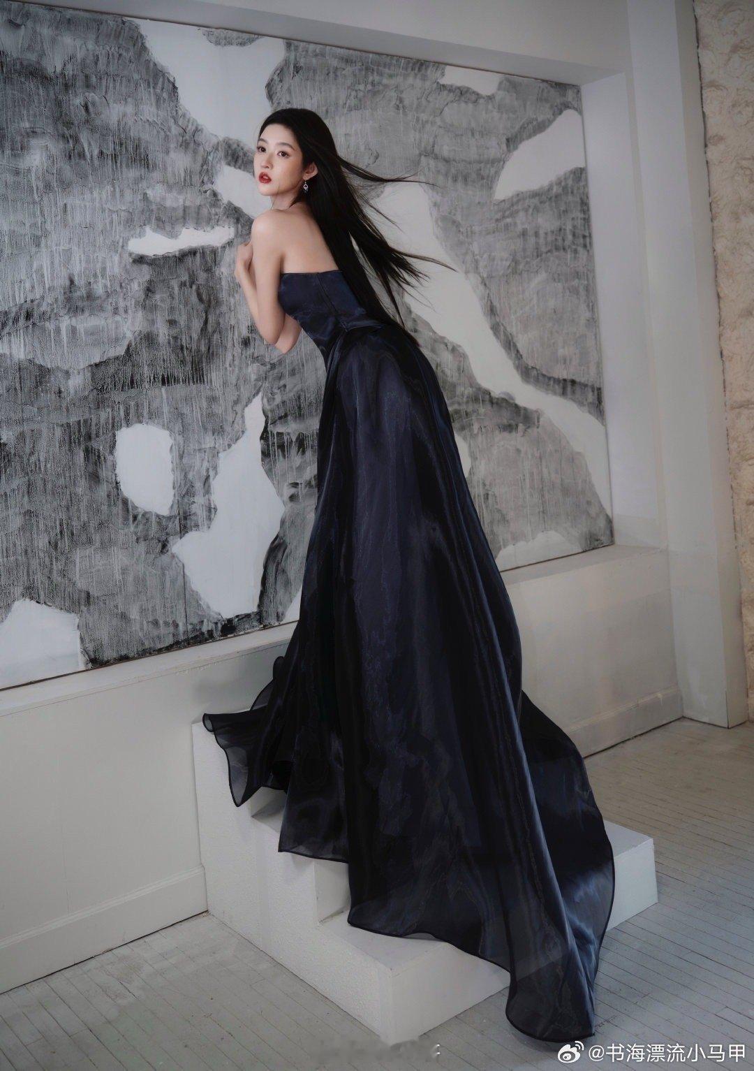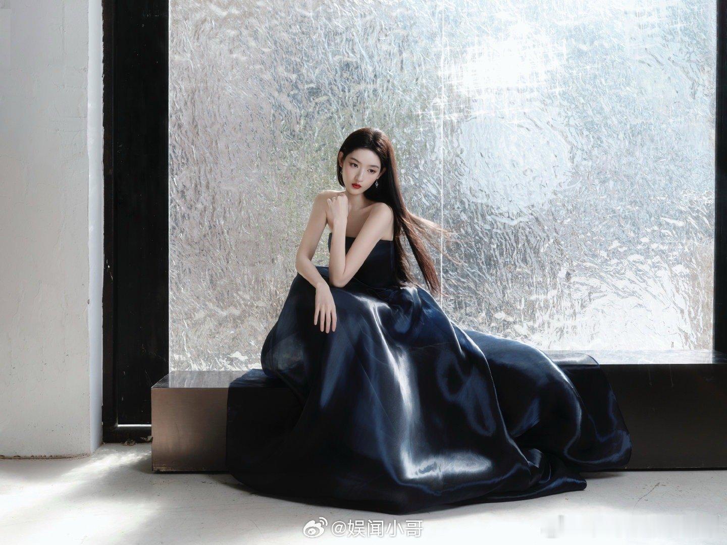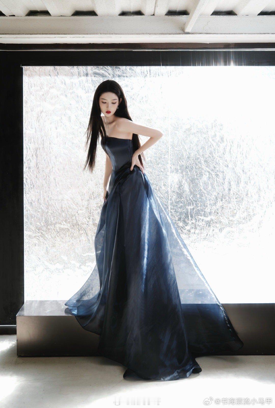 王玉雯今日金鸡奖出发图美出天际!深蓝抹胸长裙似海浪轻漾,随步伐波光流转,宛如海的