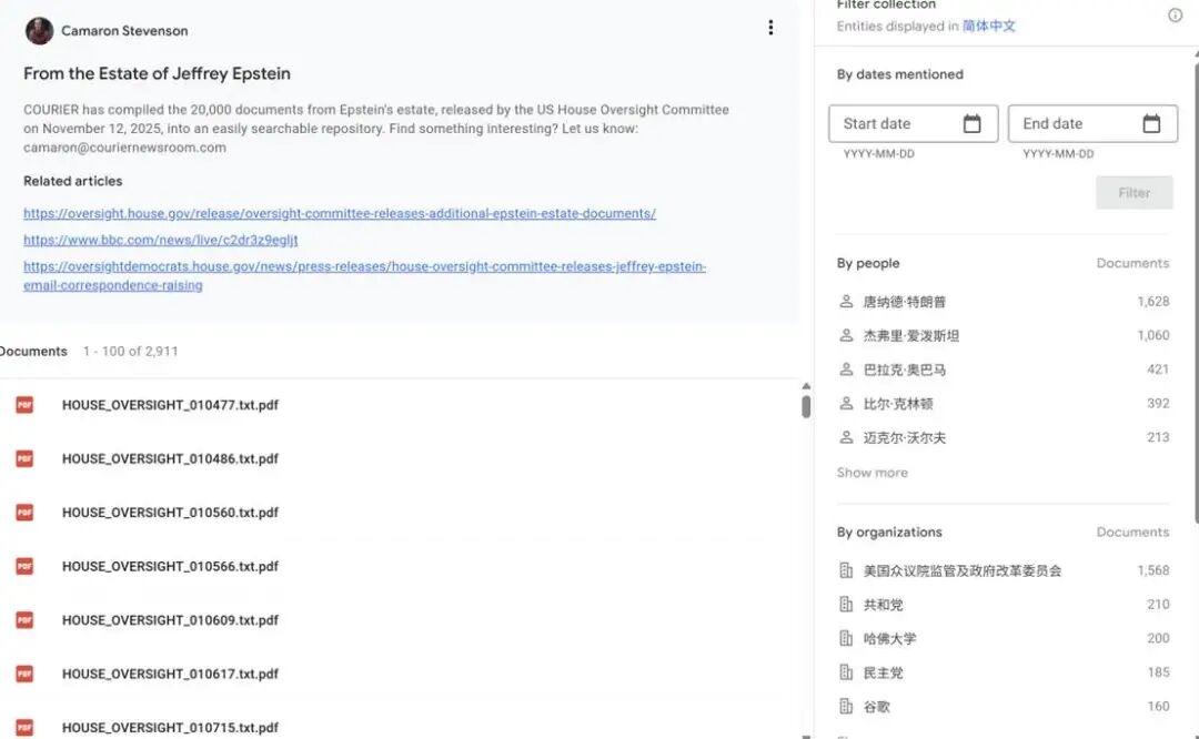美国众议院监督委员会周三公布了爱泼斯坦留下的大量文件资料,其中包括爱泼斯坦在2008年至2019年间发送和接收的2,300多封电子邮件,特朗普和克林顿的名字被提及数百次,奥巴马的名字也出现了。不过,尚未发现任何美国总统直接写给爱泼斯坦的邮件,或爱泼斯坦直接发给他们的邮件。这些邮件揭示了爱泼斯坦对特朗普政治命运和法律麻烦的痴迷。特朗普的名字出现在超过一半的邮件文件中,常常是关于他在2016年大选期间及总统任期内政策的新闻分享。爱泼斯坦还曾与一些朋友批评特朗普,向记者传递消息,并回答他的伙伴提出的关于特朗普的问题。特朗普和爱泼斯坦在上世纪九十年代和本世纪头十年曾是棕榈滩的邻居,并有交往。特朗普表示,他在爱泼斯坦于2008年就诱导未成年人卖淫而认罪之前就已断绝联系。今年,特朗普称,因为爱泼斯坦挖走他的工作人员,他已禁止其进入海湖庄园。白宫新闻秘书莱维特周三表示,这些邮件“恰恰证明特朗普总统没有做错任何事”。 爱泼斯坦留下的20,000份文件,乱七八糟地存放在众多文件夹里,标签含糊不清,还有电子邮件截图和大量涂黑的电子表格。有些文件完全缺乏上下文,例如在名为“NATIVES”的文件夹中,有一段小狗玩弄特朗普和希拉里·克林顿玩偶的视频。为了让这批庞大的数据更易查询,COURIER已将这些文件整理成一个可通过Google Pinpoint搜索的资料库。查看今天的《华府圈内》微信公众号可以直接使用该资料库。 图片来源于网络