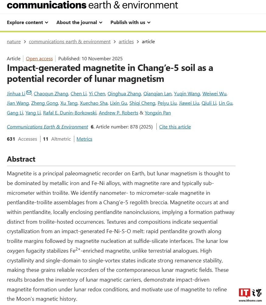 IT之家11月15日消息,据中国科学院地质与地球物理研究所官方公众号昨日分享,近期,该所李金华研究员牵头的中外团队,采用“显微学-同步辐射-微磁学”的多技术关联手段,在嫦娥五号月壤中识别出一类撞击成因的磁铁矿(Fe₃O₄)。