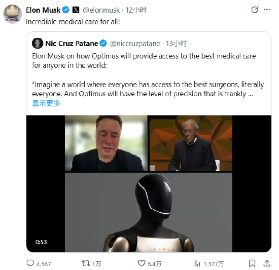 一位网友在X上分享马斯克最近接受罗恩·巴伦采访的视频片段。马斯克在采访中表示,未来擎天柱机器人将能够为所有人提供最优质的医疗服务。