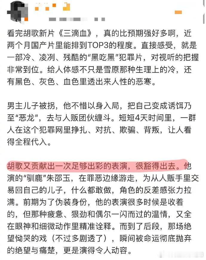 二刷《三滴血》还是被胡歌震撼到!第一次看惊叹造型颠覆,第二次看沉迷演技细节,他眼神里的算计、嘴角的冷笑、转身时的落寞,每一处都在塑造角色,完全让人忘了他是胡歌,只记得 “驯鹿” 的故事!