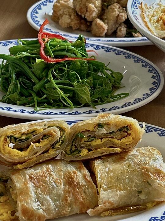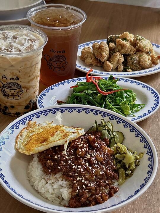 不在台灣在珠海hhh 還有敲闊耐的金毛店長 盲點不踩雷下次還要來 - 🔎 A mà 寶島阿嬤·臺式滷肉飯 🍚 阿嬤的滷肉飯 🥗 涼拌龍鬚菜 🌯 九層塔蛋餅 🧆 阿嬤王炸鹹酥雞 🧋好喝到噗咩的王牌珍奶 🧃傳統的冬瓜茶 -