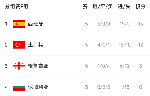 本轮大胜格鲁吉亚后,西班牙队的净胜球已经来到了+19,他们领先土耳其3分,但后者的净胜球仅为+5。
