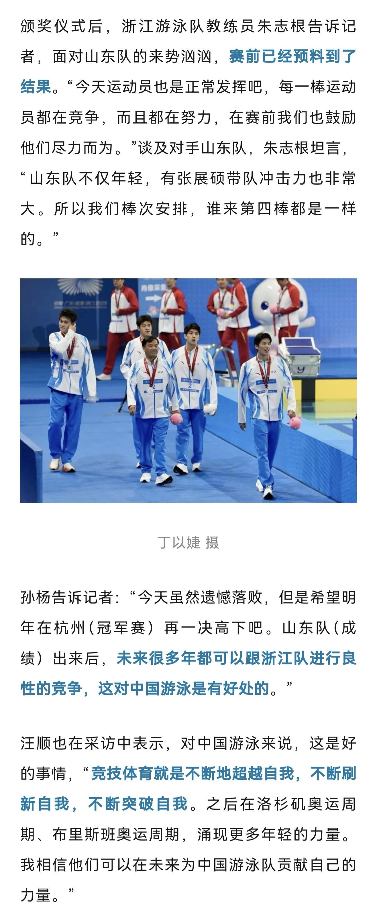 『8093』20251115 深圳十五运会男子4x200m自由泳接力决赛赛后报道支持这个支持🐽一家的体坛报👨🦳:今天运动员也是正常发挥吧,每一棒运动员都在竞争,而且都在努力,在赛前我们也鼓励他们尽力而为。山东队不仅年轻,有张展硕带队冲击力也非常大。所以我们棒次安排,谁来第四棒都是一样的。🦈:今天虽然遗憾落败,但是希望明年在杭州(冠军赛)再一决高下吧。山东队(成绩)出来后,未来很多年都可以跟浙江队进行良性的竞争,这对中国游泳是有好处的。🐰:竞技体育就是不断地超越自我,不断刷新自我,不断突破自我。之后在洛杉矶奥运周期、布里斯班奥运周期,涌现更多年轻的力量。我相信他们可以在未来为中国游泳队贡献自己的力量。cr体坛报