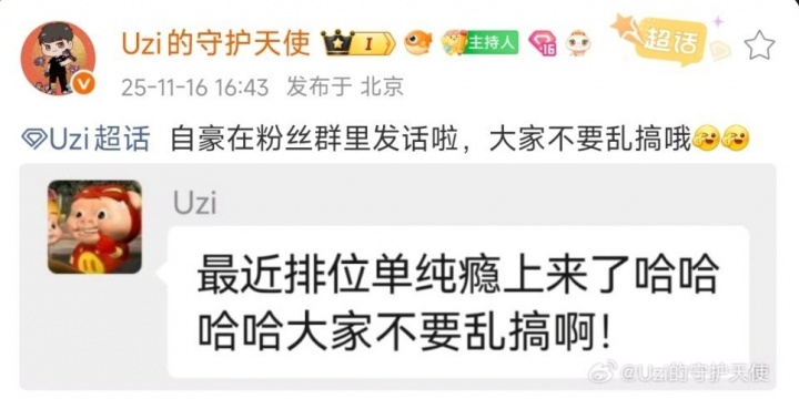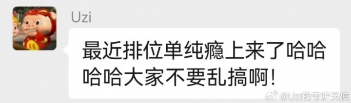 Uzi粉丝群发言:最近排位单纯瘾上来了哈哈哈,大家不要乱搞啊!
