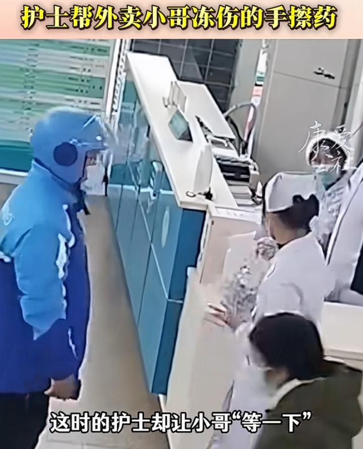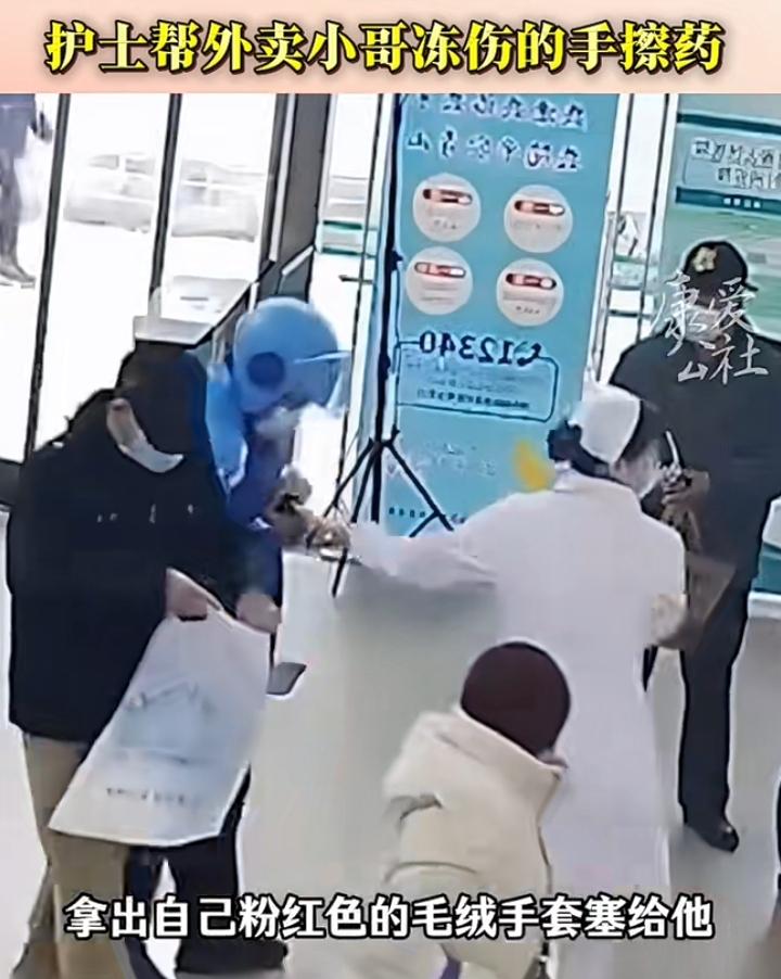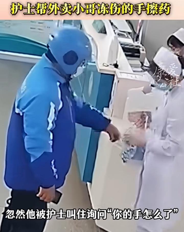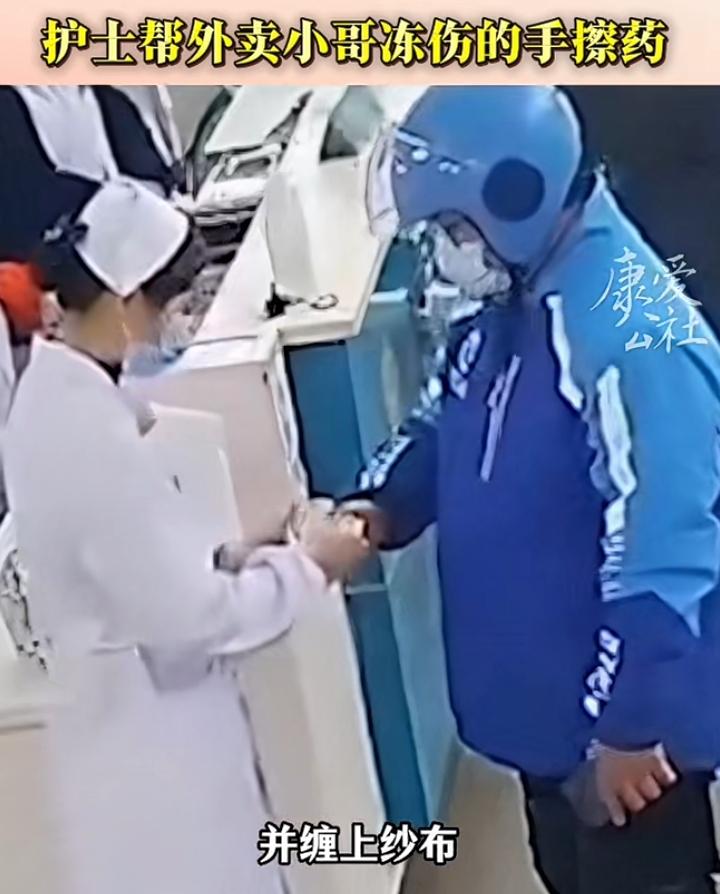 一名外卖小哥给美女护士送餐,交接完毕后准备离开,护士却突然说等一下,然后飞快的奔向内务室。 小哥站在医院的前台有点茫然,可他坚信这单没有任何问题,一没超时二没起语言冲突,难道这名护士喜欢自己,咳咳……他打乱了自己胡思乱想的心态,那护士身材苗条语气温柔,让人一听骨酥肉麻,看其体型婀娜多姿,可她这突如其来的举动真的让人意乱情迷,不知所谓的小哥只能默默等待。 大约过了1分多钟,护士拿着一支药膏对小哥说,你的手已经严重冻伤局部发紫,有轻微的裂纹这支药膏专治冬天手脚问题,于是她轻抚小哥的冻手仔细的涂抹药膏,最后用纱布进行了包扎,一边对小哥说天气转凉对自己的双手要爱护,你们跑外卖的风里来雨里去,戴个手套不影响送外卖,此时的小哥沉浸在突然的幸福里,他多么希望这一刻能变成永恒,可温馨总是那么的短暂,就在他无无以言表内心的感激之情准备离开时,美女护士从前台接待处拿出自己粉红色的手套,对小哥说先戴上御寒一下外面的严寒吧! 此时的小哥几乎哽咽,送了这么久的外卖,从来没有一个人这样的关心自己,他非常艰难的戴上美女护士的手套,也许是女生的手比较小的缘故,可那些藏在内心的善意却是无限温馨,或许你的一个小小的举动会是别人冬天里最温暖的一束光,不仅照亮别人的路也升华了自己的心灵,一切在关照中彼此温暖。
