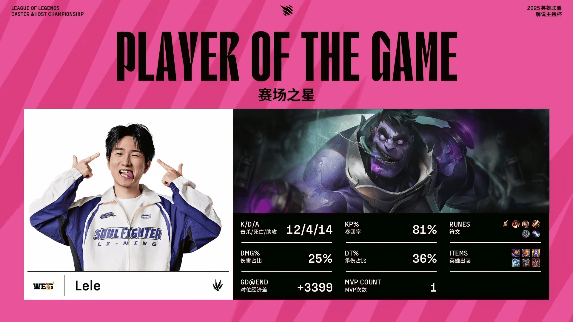 虎扑11月16日讯在刚刚结束的解说杯半决赛的比赛中,Lele蒙多砍下12/4/14的战绩,拿下WEG对阵GWS第四局MVP