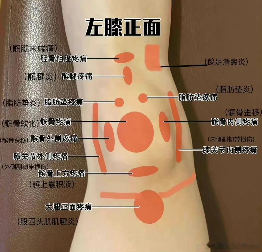【酸痛、刺痛、针扎痛】困扰你的各种膝盖疼究竟是什么?今天从具体的症状,来讲讲膝关节疼痛的损伤👇【膝关节疼痛】首先你要看你是哪里疼,其次是酸痛、刺痛还是其他痛 。【髌腱炎】髌腱疼痛一般是酸痛、破伤口痛。【髌腱末端病】髌腱末端病一般常见于青少年。【鹅足腱滑囊炎】👉跑步过程中鹅足位置出现刺痛、牵扯痛,严重者站立、走路都会出现疼痛(图1)👉疼痛产生人群——一般膝关节内扣的女生,以及膝关节十字韧带(自体腱)重建术后容易出现。【膝关节胀痛和按压痛】👉脂肪垫位于髌腱两侧,常出现胀痛,膝关节过伸时此处有挤压痛(图2)👉疼痛产生人群——常见膝盖长期弯曲走路、过度伸直、膝关节术后、体重过大的人群。【内外侧副韧带损伤】👉膝盖内侧疼痛则可能是内侧副韧带损伤,大多是由于韧带拉伤或扭伤导致(图3)而外侧膝盖疼痛有可能是外侧副韧带损伤,也有可能是髂胫束摩擦综合征。【肌腱炎】膝关节后侧这四角区域出现酸痛,需要考虑肌腱炎损伤(图4)【软骨损伤】👉出现的症状——较轻时候是膝关节里面说不清的酸胀,严重时候是针刺痛,容易出现在膝盖正后方以及膝盖骨一圈。常表现大腿发力就会痛,甚至坐在床上不动都刺痛,这种情况需要考虑软骨损伤了。👉处理办法——软骨损伤并不是不可救,只是我们需要找到你造成软骨磨损的原因,从运动力学角度调整力线,重塑运动模式,帮助你们回归正常生活和运动中。 不要让疼痛影响你的心情,早点知道你的疼痛是为什么,及时检查、及时康复