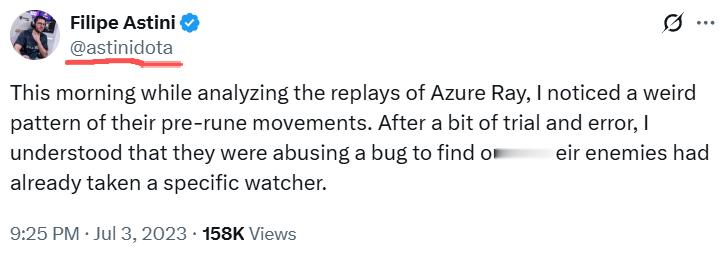 蒜头辟谣查猪说他和P-VISION教练有仇一事称当年巴厘岛major观察者事件就是PARI教练举报的查猪,自己跟Astini完全没关系最多只是看不惯他在TI的赛后采访,有机会想直播搞个查理斯辟谣台弹幕:猪哥说P-VISION真正的仇人是你,AR时期就产生了矛盾延续到了XG,你跟他们教练有仇?毁灭蒜头:哪来的仇啊?我和P-VISION的人没仇,说实话我只是看不惯他们TI的那个赛后采访说中国观众报点什么的,主要就是Dukalis和Astini在说,但不至于到有仇的程度吧,他们队来中国打雪如意还找我问了很多事情比如外卖软件啥的,Noone和Dm电梯里碰到我还跟我聊天打招呼呢。真正跟他们教练有仇的应该是猪哥,当年巴厘岛major就是Astini(当时他是nouns教练 图2)举报查猪用观察者bug要禁赛AR的,后来还是我去找主办方PK申诉的,那次Astini根本不在,我跟他都没见到面,只能说查猪又在造谣了,我明天搞个新节目好吧,查理斯辟谣台