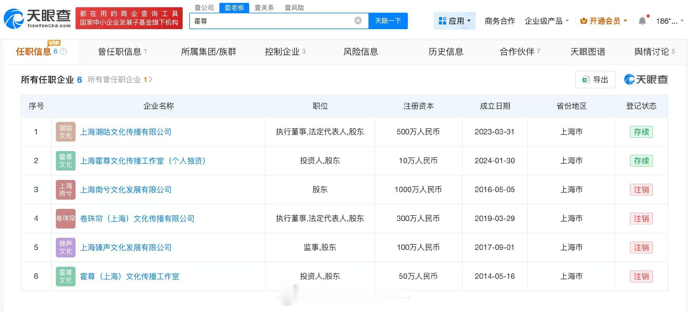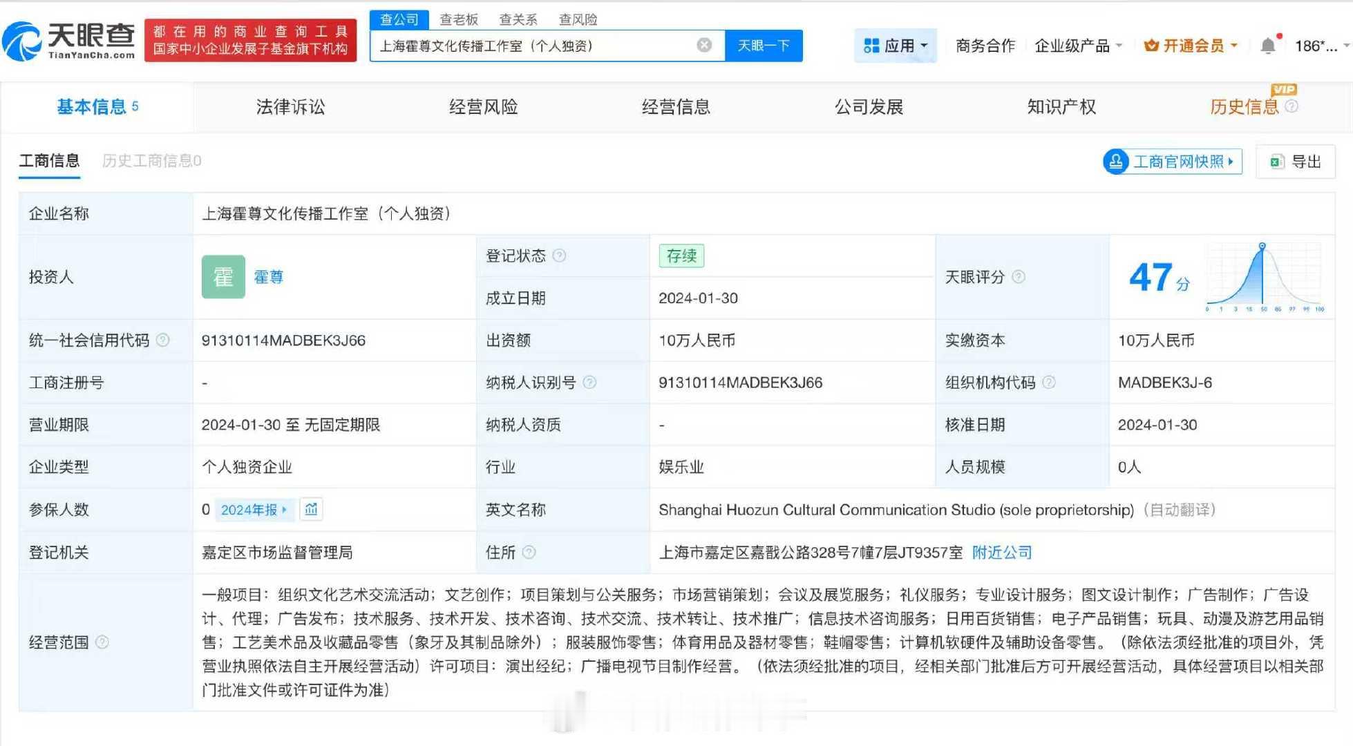 【】11月16日,霍尊在音乐节演出多首代表作,引发网友关于其复出的讨论。据媒体报道,此前霍尊前女友陈露发布长文揭露与霍尊9年恋情指控其出轨,霍尊曾宣布退圈。天眼查App显示,霍尊名下共关联6家企业,其中2家为存续状态,包括上海潮咕文化传播有限公司、上海霍尊文化传播工作室(个人独资),涉及文化传播领域,霍尊在上述公司担任执行董事、法定代表人等职务。值得注意的是,上海霍尊文化传播工作室(个人独资)成立于2024年1月,投资人为霍尊,出资额10万人民币,经营范围包含文艺创作、项目策划与公关服务、市场营销策划等。