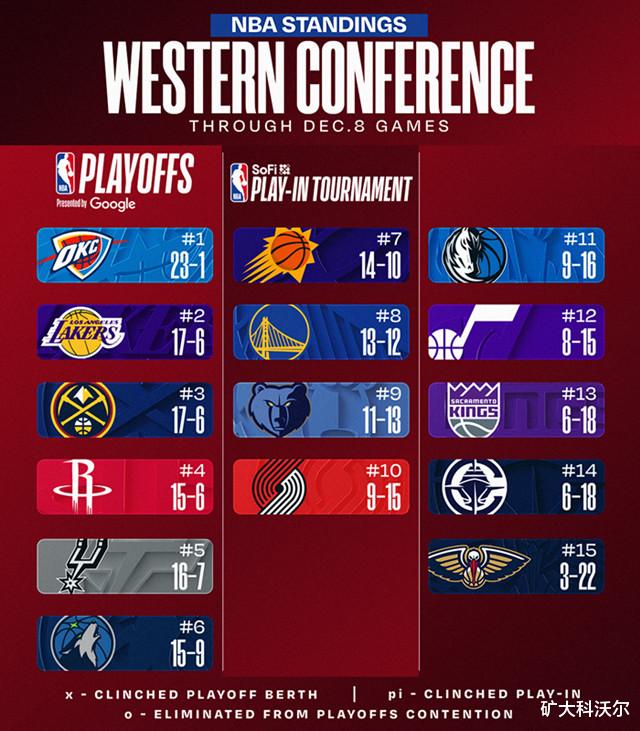 火箭15胜6负排第4,近期输给爵士和独行侠有点伤,马刺今日险胜鹈鹕,战绩来到16胜7负排西5,森林狼的5连胜被太阳终结,但战绩15-9依旧位列西6!