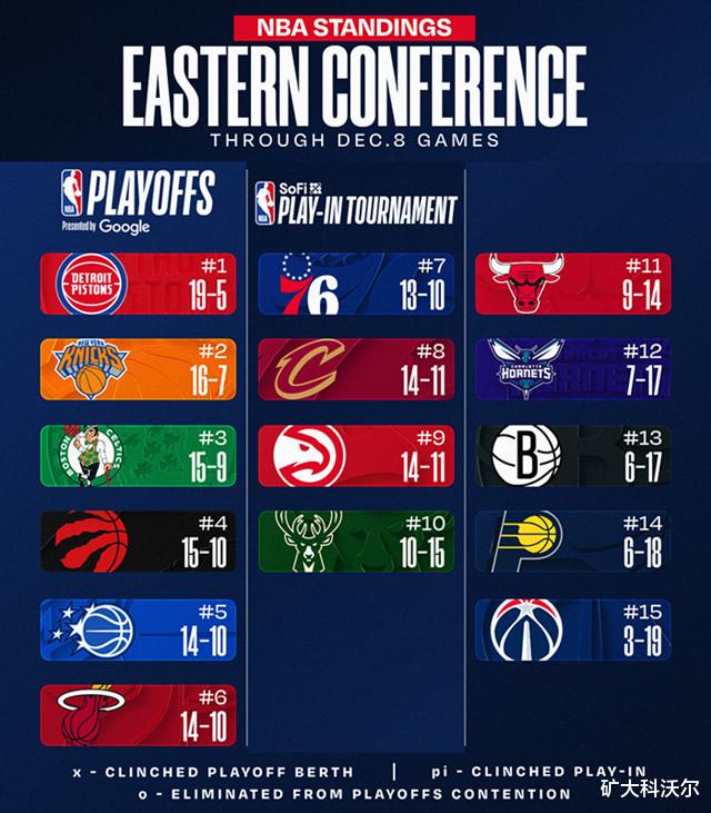 东部这边,活塞还是领头的,之前那波13连胜太顶了,尼克斯是第2,绿军凭借5连胜蹿到了东3,猛龙、魔术和热火分列其后,费城、骑士、老鹰和雄鹿则在附加赛区域。