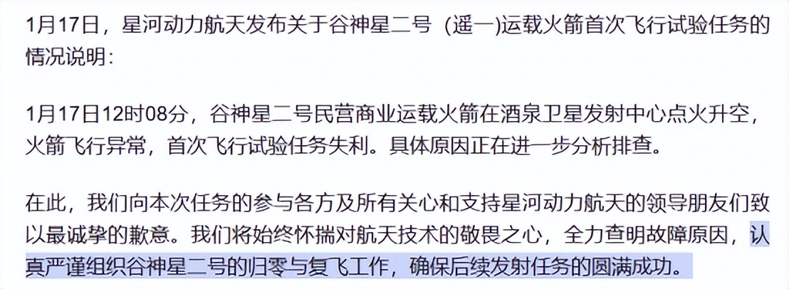 好在他们官方的精神还不错,1月17日下午6点左右,公司发了通告,对外宣布了一些情况。“组织归零与复飞工作”,能看出来星河动力并未被挫折打败,这很好。