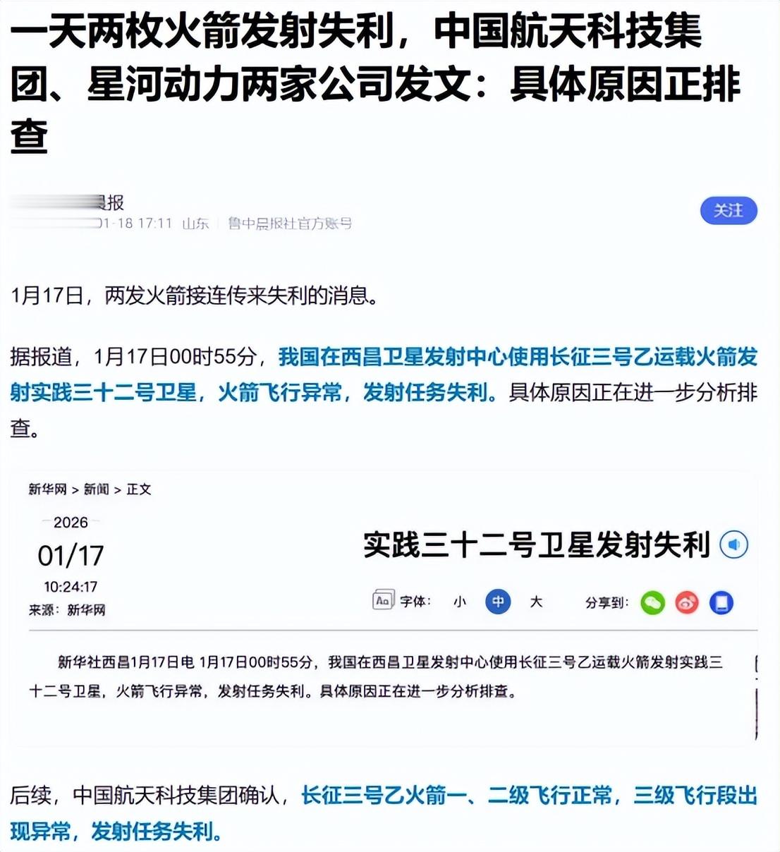 一天两枚火箭发射失利,中国航天科技集团、星河动力两家公司发文:具体原因正排查——2026-01-18 17:11——鲁中晨报