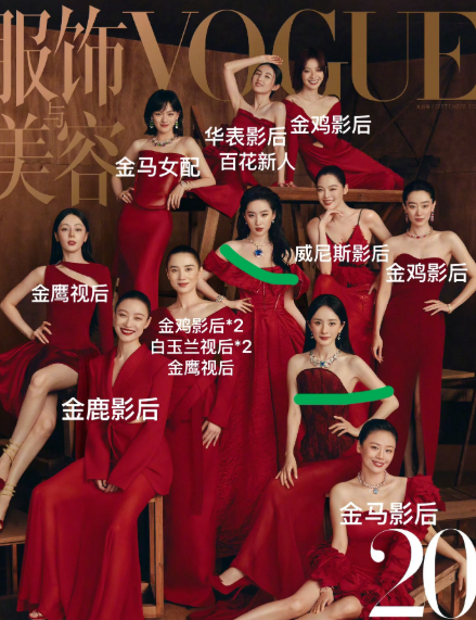 刘亦菲没有想到 杨幂也没有想到 一群人她俩争得最凶,到哪儿都要压轴,看看奖项却是颗粒无收。 Vogue 20周年这张图现在看着有点尴尬了,一代不如一代真不是说的,vogue 十周年哪个不是顶流,手握奖项的,二十周年不论奖项和作品流量和背景为王,一个迪士尼公主站在最中央,我们自己的演员不能站。