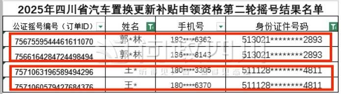 针对以上情况,我厅按照《2025年四川省汽车置换更新补贴实施细则》关于“在一个自然年度内,每位个人消费者最多享受一次汽车置换更新补贴”的规定,对于郭某林、王某在2025年四川省汽车置换更新补贴申领资格第二轮公证摇号中的两次中签仅认定中签一次,另一次中签无效,相应的两个补贴申领资格在第三轮公证摇号作相应增补。
