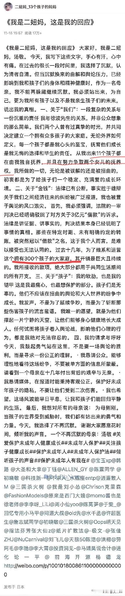 有没300个孩子不确定,但是有13个孩子是实锤,而且是同一个妈生的。(正是这位13子之母“二妞妈”声称某人有一个300个孩子的大家庭—见图4) 二妞妈是他的多年女友,给他生了13个孩子,而且,应该为他管理了这个🈶300个孩子的大家庭十几年[尬笑]。 二妞妈也就是被控诉“卷款”3亿那个女友[狗头],但是法院说这3亿无需归还。(见图3)