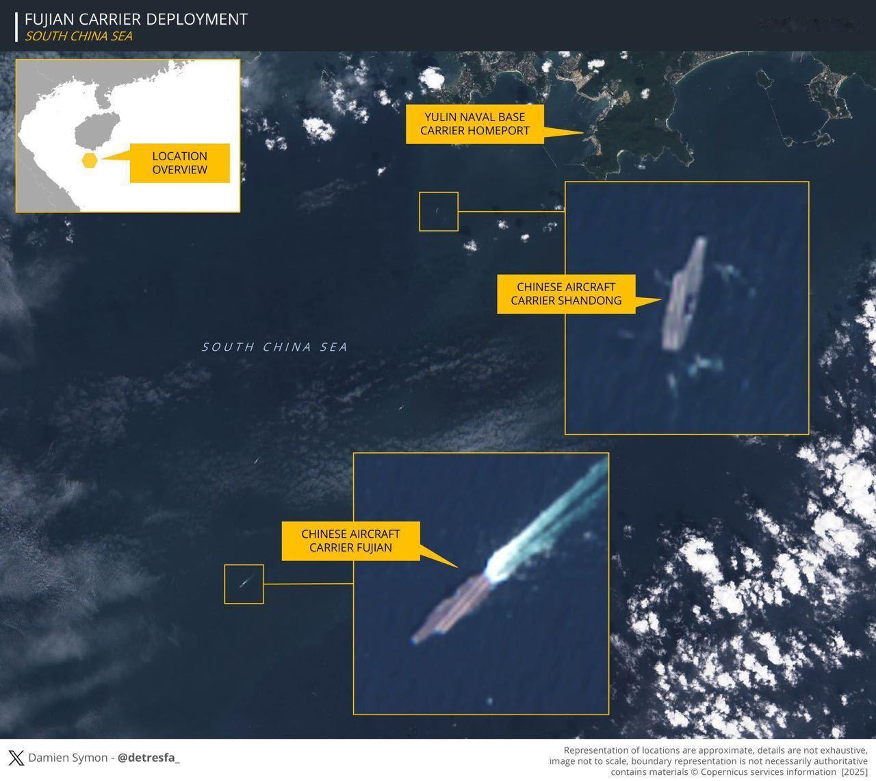 福建舰入列后首次出海训练——外媒发布的卫星图像显示,11月17号,入列后的福建舰首次离港进行训练活动。 与此同时,山东舰也一同离港。 同行的还有两艘055型万吨大驱和一艘054A导弹护卫舰,虽说阵容不大,但这吨位放在全球任何一个地方,都不容小觑。 福建舰正式服役,不仅意味着中国海军从“家门口”走向了“深蓝”,更标志着我国在工业、科技与战略意志上完成三重突破,实现了全球海洋综合实力的历史性跨越,奠定了世界性大国海军的坚实基石。 什么叫“世界性海军”? 简言之,就是能在东太平洋、印度洋、地中海乃至大西洋这些全球主要海域能逐渐形成常态化巡航部署、独立作战、实施战略威慑与力量投送的能力。 这种能力的核心载体,是具备高续航、高战力、高可靠性的大型电磁弹射航母及其配套远洋打击群。 当然,目前仅仅是训练,力图快速形成完整战斗力,大家看看目前的周边局势,是不是有些紧迫感了?