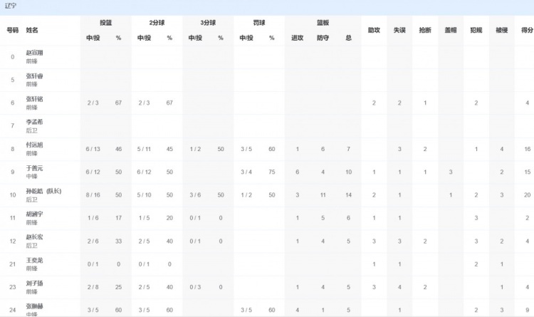 辽宁队方面,孙乾皓20分14篮板2助攻,付远旭16分7篮板。