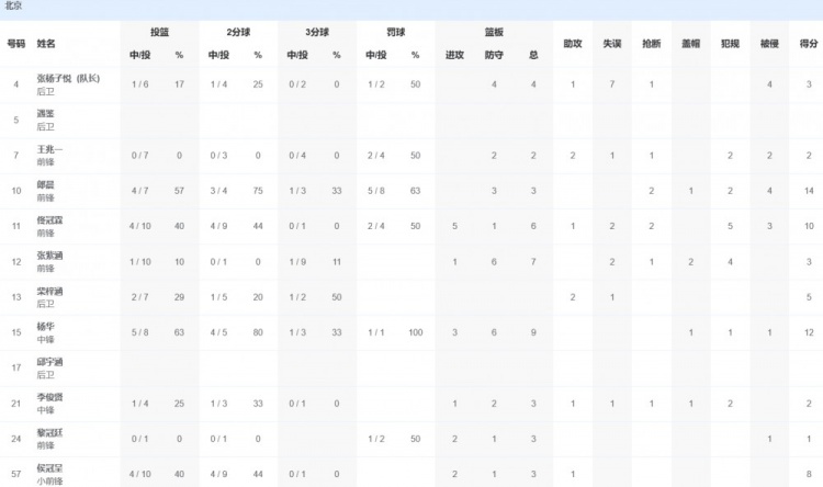 北京队方面,郎晨14分3篮板,杨华12分9篮板。