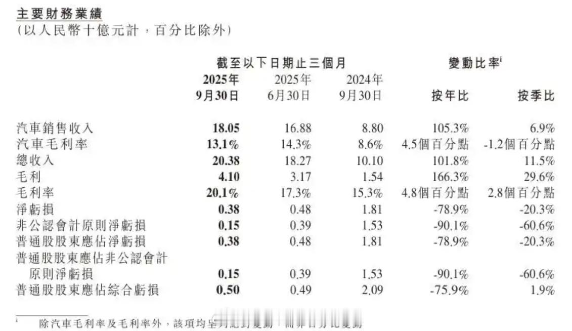 小鹏卖爆了。小鹏刚刚发布第三季度财报,第三季度,小鹏汽车共交付11.6万辆汽车,同比增长149.3%,环比增长12.4%;实现营业收入203.8亿元,同比增长101.8%,环比增长11.5%。无论是营业收入还是交付量,同比都是翻倍的涨。这是小鹏单季度收入首次破200亿,并且小鹏汽车综合毛利率在第三季度首次突破20%,达到20.1%,那小鹏是不是已经开始不亏损了?或许在第四季度,就要正式开始盈利了。小鹏第三季度净亏损3.8亿元,上年同期为净亏损18.1亿元,今年第二季度为净亏损4.8亿元。能看出来小鹏的亏损在迅速收窄,毕竟现在新势力能做到盈利的还没有几个。早在2024年,小鹏汽车还深陷销量下滑的泥潭,在2025年迎来了爆发式增长,前10个月累计交付量已达355,209辆,同比增长190%,这一增速远超行业平均水平,甚至让部分传统车企望尘莫及。何小鹏年初曾表示,有望在四季度实现盈利,何小鹏还说,小鹏销量规模和市场份额正处在高速扩张的早期阶段,增长的日子,还在后头呢。