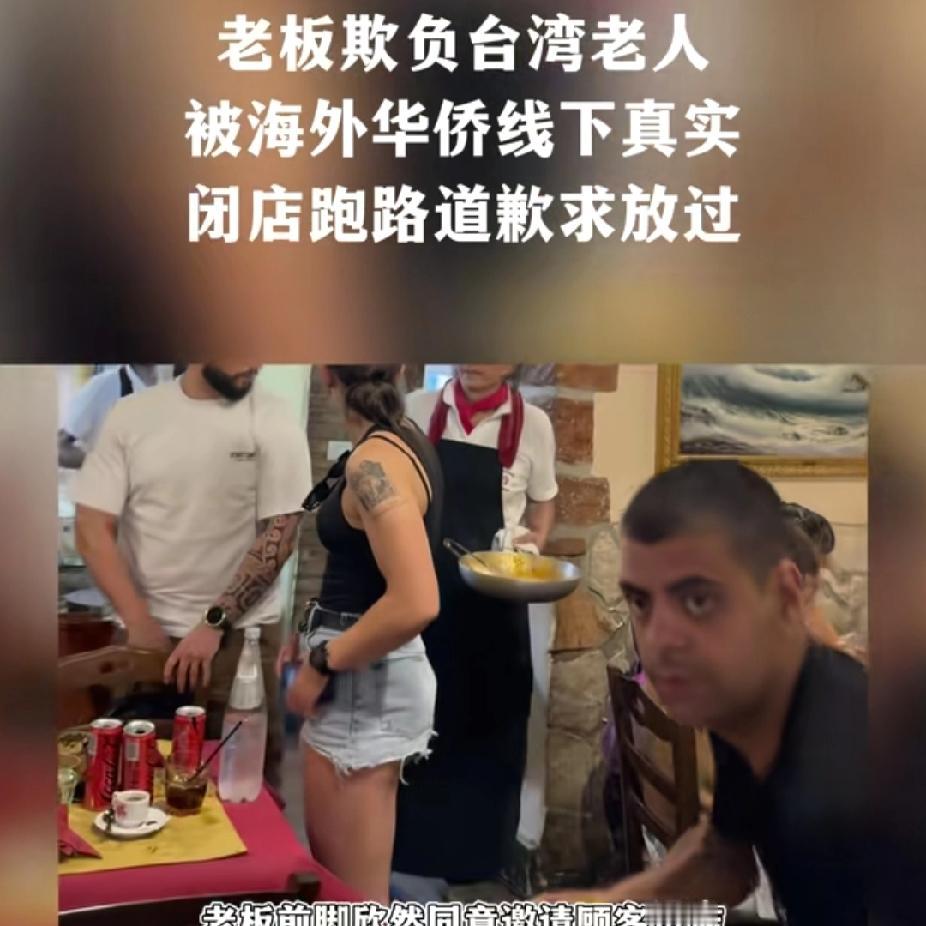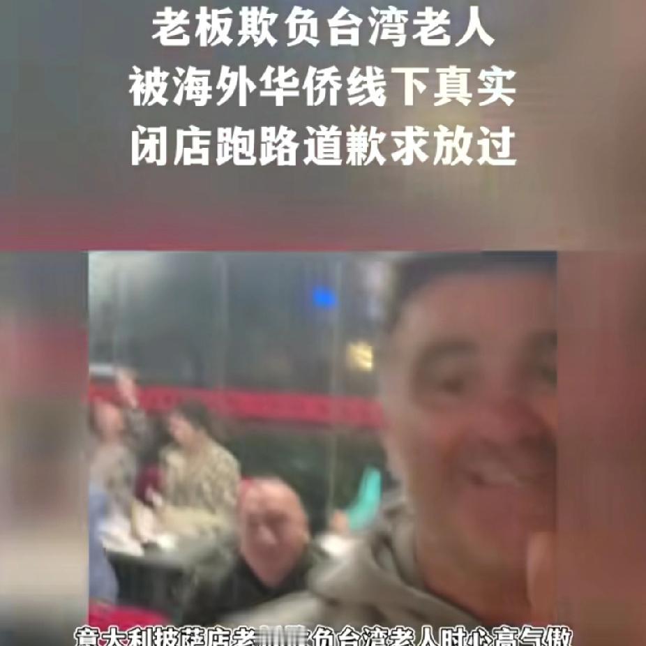 意大利披萨店老板羞辱台湾老人,后续来了,真是大快人心。 事件起因是一群中国台湾老年游客,在意大利蒙特卡蒂尼镇的一家披萨店用餐,导游提前已经告知老板,说老人胃口小,点餐量不会太多。老板当时也表示同意。 结果没想到16名老人只点了5张披萨和3瓶啤酒。这下老板不乐意了,觉得16个座位却点如此量少的餐,心生不满,于是拿起手机拍游客,当得知游客是中国台湾人后,他就用意大利语发表侮辱性的言论。 然而当时很多老人听不懂意大利语,还以为老板是在与他们友情互动,他们还笑着对镜头打招呼。老人们在离开时还向老板夸赞食物美味。 然而老板却将这种含有侮辱性内容的视频,发到个人社交平台上。直到视频在网络上传播翻译后,老人们才知晓自己遭到了恶意的羞辱。事件很快在华人社区发酵,华人不仅翻译视频,而且标注侮辱性语言,还整理店铺及老板的关键信息,扩散向当地的旅游机构和市政府进行投诉。 舆论发酵后,老人们得知自己被侮辱。如若启动起诉流程,旅行团配合出庭的话,每位老人估计可能获得几万欧元的赔偿款。此外大家还在给该店刷差评,并且打爆电话。意大利的本地不少网友也谴责老板。 新闻主流媒体也进对此事进行了报道。目前该披萨店已经关门歇业。老板顶着舆论的压力公开发视频道歉,并且喊出“我爱中国”的口号。所以他真是活该!