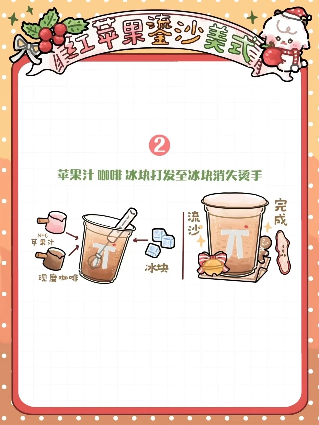 2️⃣苹果汁🧃260g 现磨咖啡☕36g 少许冰块🧊,加热棒加热打发至冰块消失杯子烫手即可👍