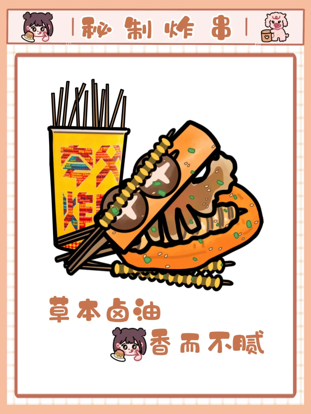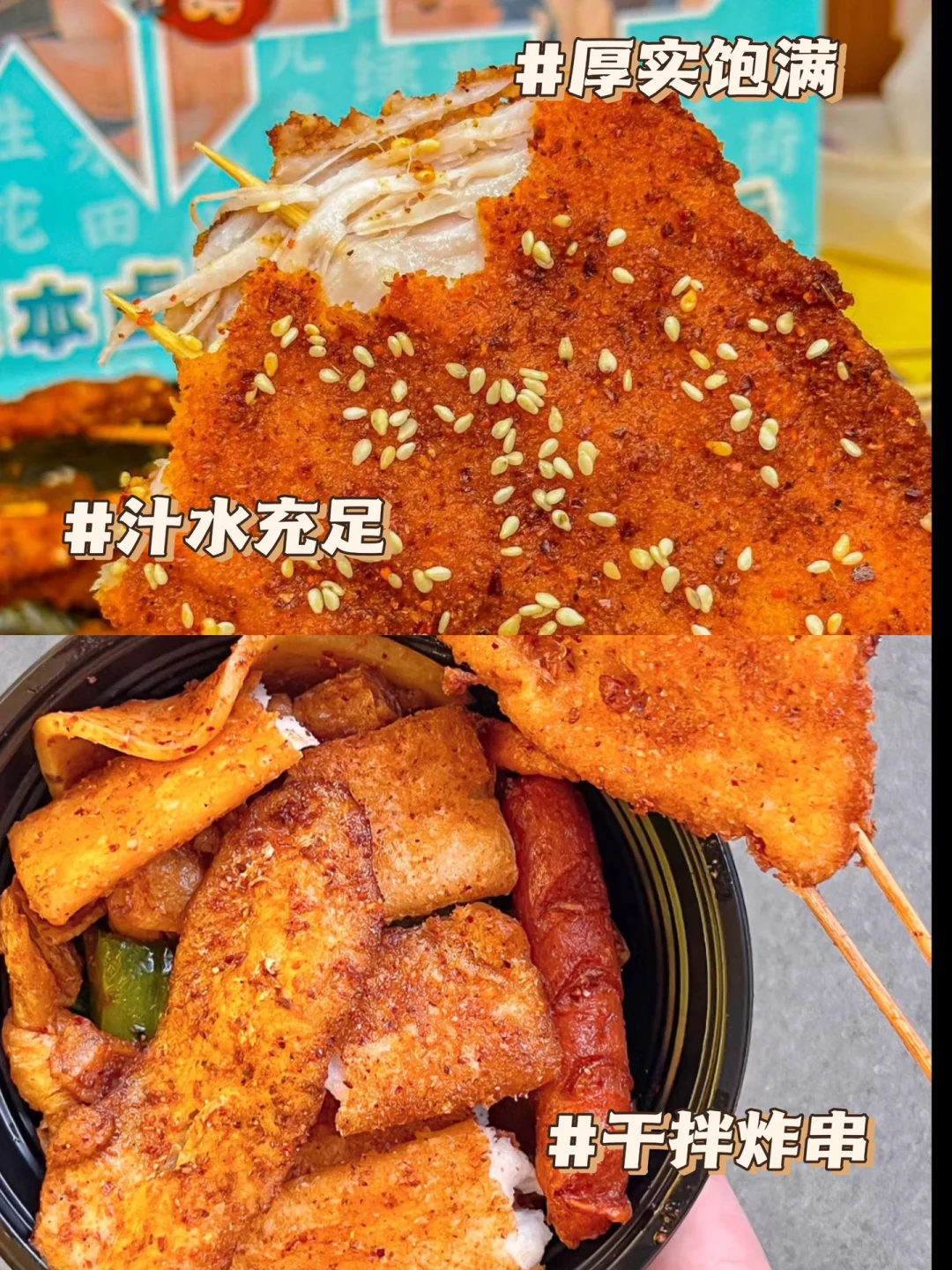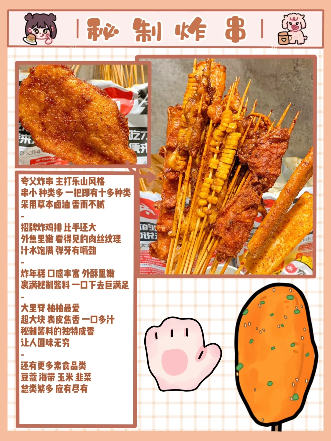 今日份秘制炸串🐙来喽!没有人能拒绝和三五好友一起炫炸串吧!用独特的草本卤油配方制作而成的炸串超香,外酥里嫩 很好的锁住了食物本身的汁水,一口一口停不下来‼比手还大的巴掌大鸡排 巨大鱿鱼 大块里脊 学校门口的大年糕 我真的太爱了🎉