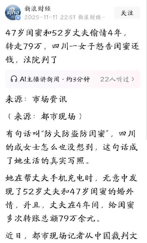 防火防盗防闺蜜!11月13日报道,四川巴中,女子帮丈夫手机充电时,无意中发现,52岁丈夫竟然和47岁的闺蜜搞在了一起,而且,已经持续了4年之久。更气愤的是,这4年间,丈夫给闺蜜多次转账,总额高达79万余元,其中不乏520,1314这种暧昧的数字。同床共枕23年,却遭遇丈夫和妻子双重背叛,女子彻底怒了,告上法庭要求闺蜜还钱。法院经过二审,给出了截然不同的判决。 戚女士没想到自己生活里的“防火防盗防闺蜜”竟然成了血淋淋的现实,她同床共枕23年的丈夫,居然在背后和自己最亲密的闺蜜暗通款曲整整4年,还偷偷转走了79万多元。这一切,直到有一天帮丈夫充手机,她才发现这场荒唐的背叛。 1999年,戚女士和杜先生结婚,后来两人在山西务工时认识了程女士夫妇,双方越走越近,尤其是戚女士和47岁的程女士成了无话不谈的闺蜜,家里大小事都愿意互相分享。 戚女士从没想过,把心掏给闺蜜,会换来背叛。 事情发生在2022年一天,杜先生喝醉回家,戚女士帮他充手机,解锁后弹出的微信消息让她如遭雷击。 聊天记录里,丈夫和程女士互称“老公、老婆”,内容暧昧不说,更下方还有密密麻麻的转账记录。 4年间,不仅大额款项频繁往来,还有520、1314等满载情意的数字款项。 追问之下,杜先生终于承认,早在2018年,他就和程女士发展成婚外情。 这一刻,戚女士彻底崩溃了:丈夫和闺蜜,这两个她最信任的人,联手给了她最深的伤害。 更让她无法接受的是,这些钱都是夫妻共同财产,4年里杜先生通过微信和银行累计转给程女士791316元,而程女士只返还了447822元,实际多拿了343494元。 戚女士气愤又心痛,多次要求程女士还钱,但对方坚决不认账,戚女士无奈,只能走上法律途径。她将程女士告上法庭,要求返还全部不当得利。 程女士辩称这些钱不是赠与,而是“合法经济往来”,比如杜先生欠她丈夫的工程款,或者在她开的麻将馆借过的钱,但她拿不出任何合同或借条支持。 一审法院认为,双方存在经济往来,不宜全部认定为赠与,只判返还一半,也就是171747元。 这个结果让戚女士无法接受:丈夫私自处分夫妻财产,闺蜜明知有家庭还接受钱款,凭什么自己只能拿回一半?她随即提起上诉。 二审时,巴中中院判决完全不同。法院认为,杜先生在婚姻存续期间,未经戚女士同意,将夫妻共同财产转给情人,不仅侵犯了戚女士的财产权,也违反了公序良俗和家庭伦理,赠与行为本身无效。 程女士声称的“合法经济往来”,缺乏证据支持,不能成立,最终,二审撤销一审判决,判程女士全额返还戚女士343494元。 判决一出,网友纷纷点赞:“这才叫公道!背叛者必须付出代价”,“夫妻共同财产不是私人财产,不能拿来养情人”。 懂法的人都清楚,夫妻共同财产一方无权擅自处分,尤其为了婚外情的赠与,违反公序良俗,必然无效。 一审的“酌定返还”不仅不合法,也纵容不道德行为,二审的改判才真正维护了法律底线。 戚女士经历了双重背叛,但最终用法律拿回了公道。 这件事也提醒所有人:婚姻里的忠诚不是随便说说的,背叛不仅伤害感情,也可能触犯法律。 所谓的闺蜜情,也必须守住底线,逾越的后果必须承担。 希望真心待人的人,都能被温柔以待,也希望法律始终守护正义,不让背叛者得利。 对此你怎么看? 信源:浪涨新闻