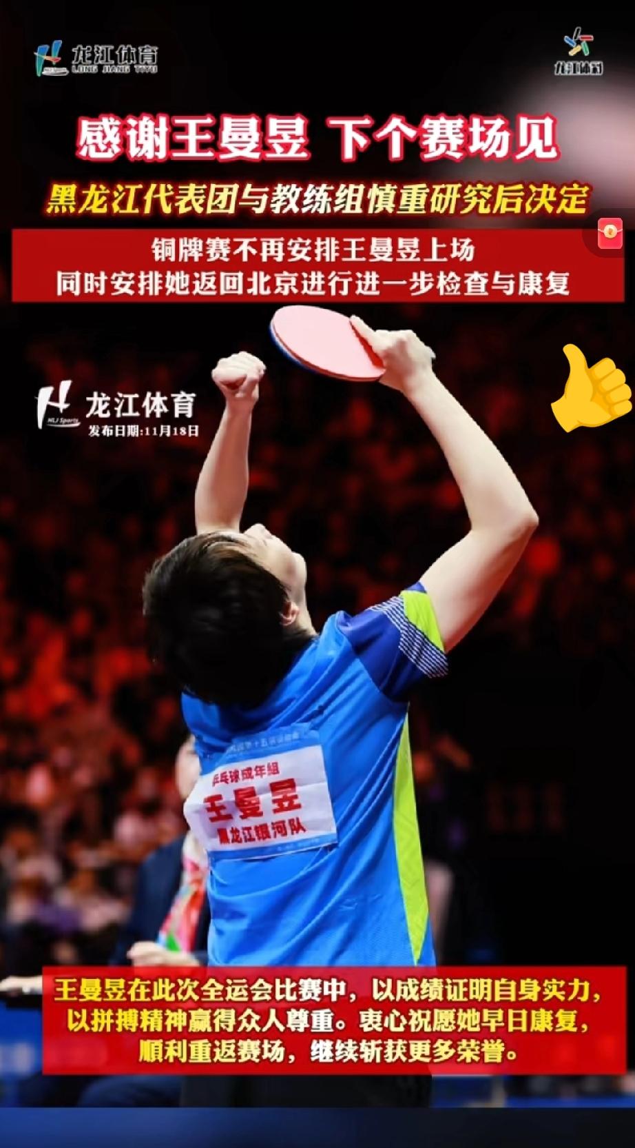 来自娘家人的宠爱,王曼昱因伤退出团体比赛了,真是太暖人心了! 当看到鳗鱼出现伤病的时候,也是牵动着广大球迷的心,这次全运会鳗鱼也是成绩亮眼,拿到了全运会的卫冕女单冠军,这背后不光是个人的付出,也是团队的全力保障! 这次团队很给力,谁家的孩子谁心疼啊,知道这次鳗鱼也是咬着牙,把最后一局打完,让团队成功晋级了四强,所以在铜牌争夺赛,不在安排王曼昱上场了,安排人陪着鳗鱼一起回京检查身体,让其尽快康复,养好身体继续下一站的比赛! 鳗鱼是娘家人的宝贝,姑娘争气,娘家人也心疼她,这次为娘家点赞