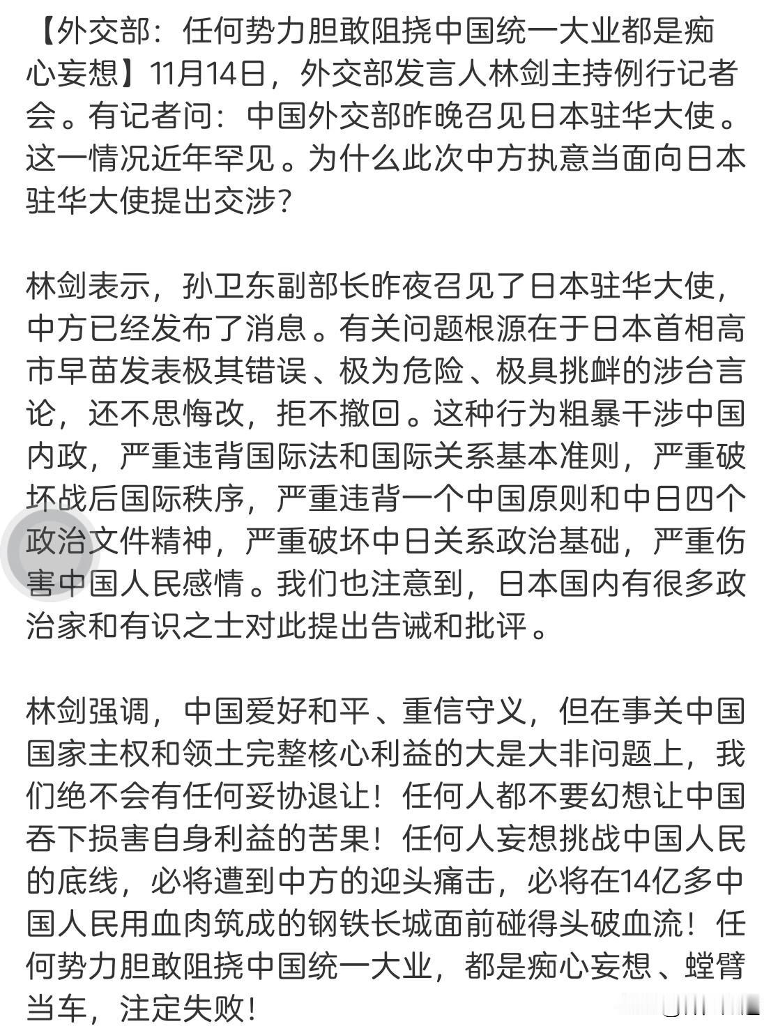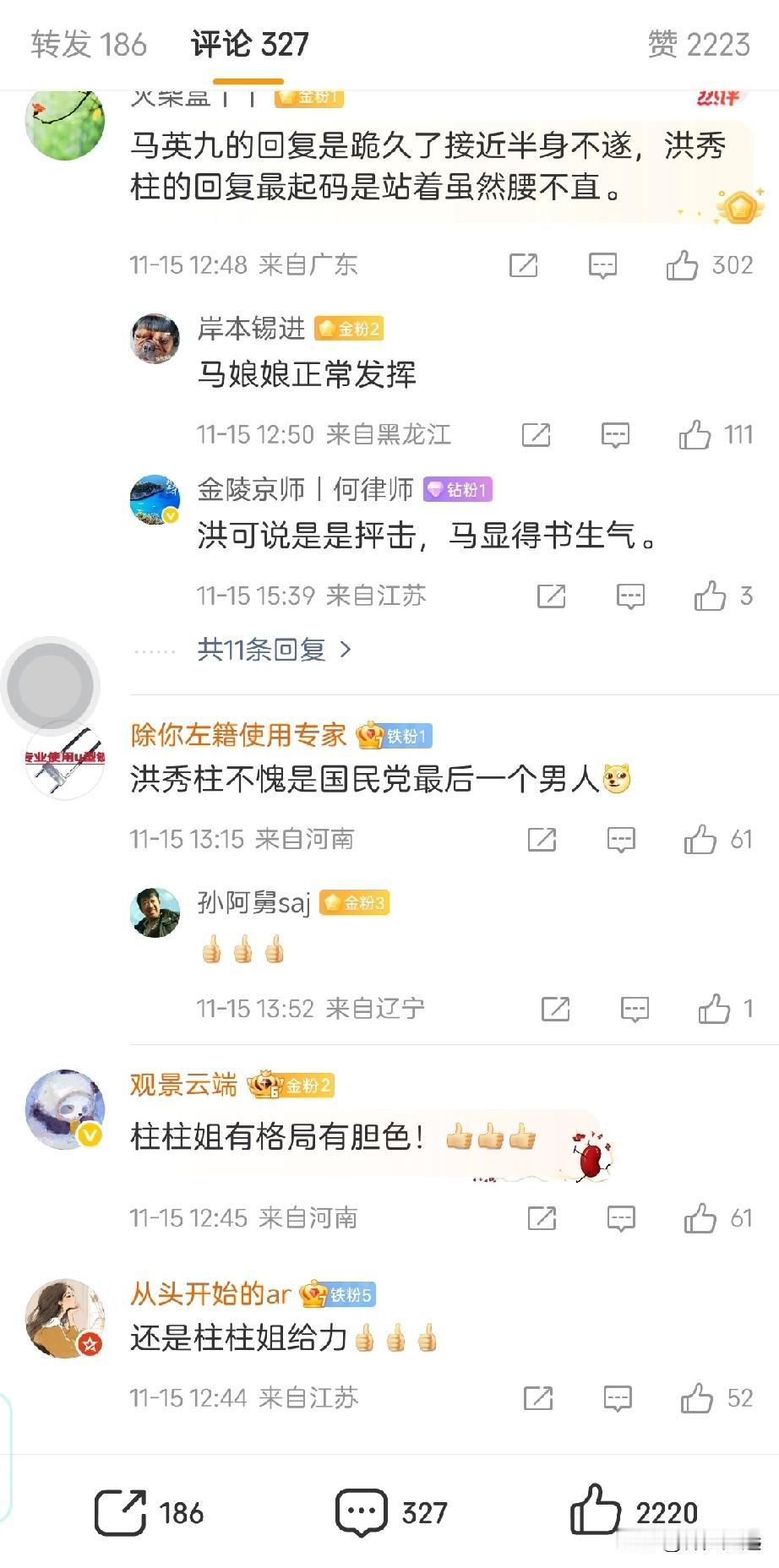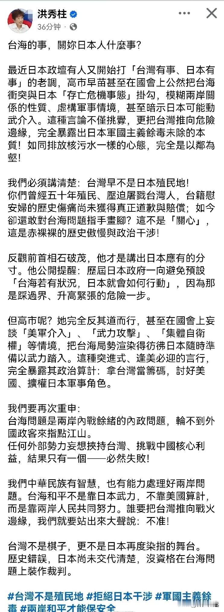 高下立判!马英九、洪秀柱对高市早苗言论的回应。 马英九还在摆事实讲道理,可谓“虎狼屯于阶陛,尚谈因果”。貌似和平理性非暴力,实则尽显文人气书卷气,真是百无一用。 相对而言,洪秀柱则以“关你什么事”定调,字里行间尽是中华民族的英雄气概,不愧是国民党的“真男人,硬汉子”。 最霸气的当然还是外交部的回应,任何人想挑战中国核心利益“必将碰的头破血流” 倒是希望【搞事遭秒】能说到做到千万别食言。 高日早苗