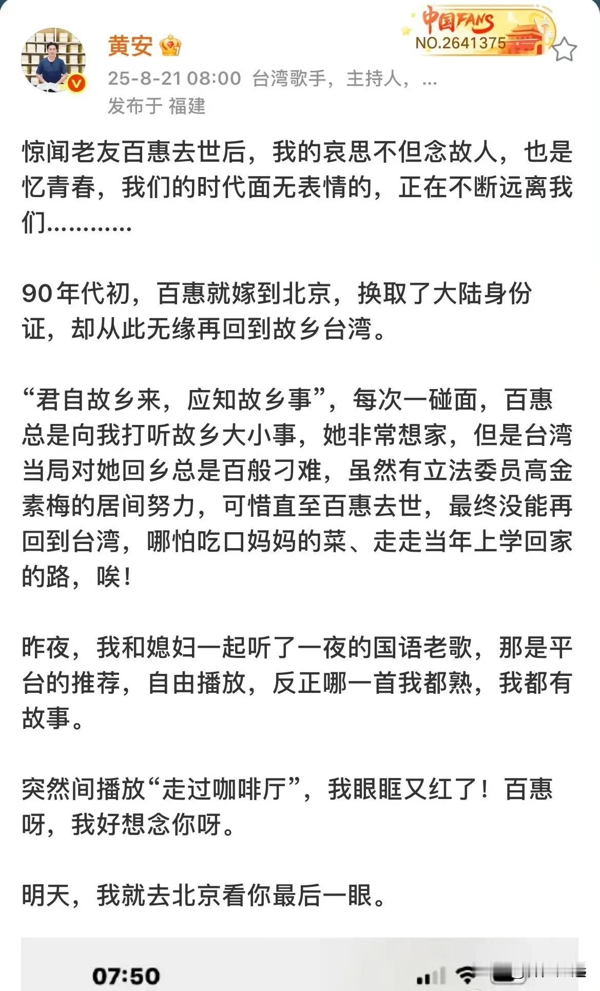 “但悲不见九州同 ”千百惠唯一的遗憾也是没有看到祖国统一。 就在8月3日,史学泰斗许倬云先生也带着相同的遗憾永远的离开。 可以告慰两位的是,国家越来越强大,相信在不久的将来,我们一定会迎来祖国统一的时刻。 “王师北定中原日,家祭无忘告乃翁。” 随着越来越多的台湾人像馆长一样转变,敢大声的说“我是中国人”,两岸统一一定会尽快实现。 这样的遗憾一定会越来越少! 千百惠唯一遗憾 许倬文