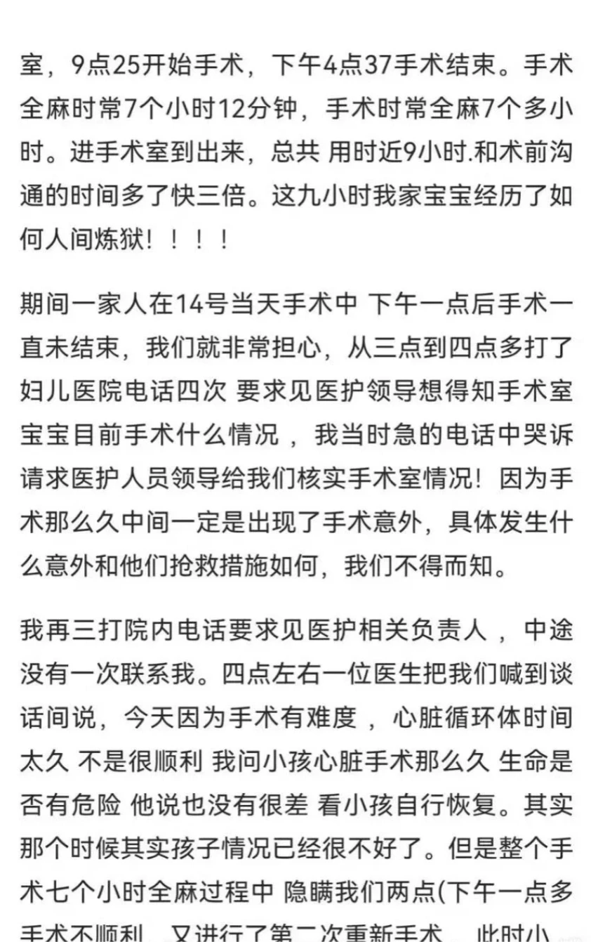 蓉蓉夫妻俩出于信任专家,在11月14日带洛熙住院手术,谁能想到,这场“简单手术”成了噩梦——原定2.5小时的手术做了近7小时(全麻7h12m),期间家属多次打电话询问,医院始终没主动说情况不对