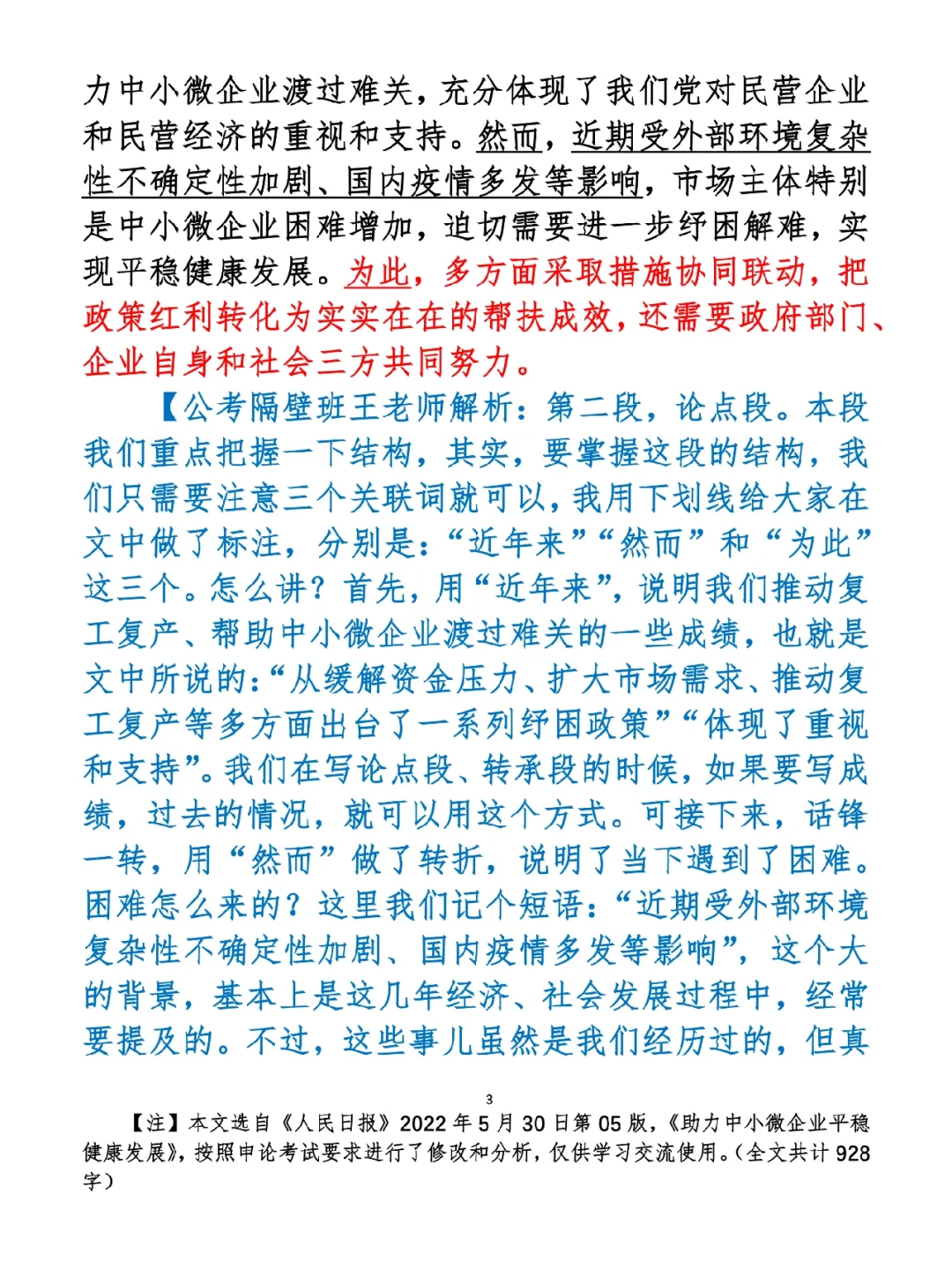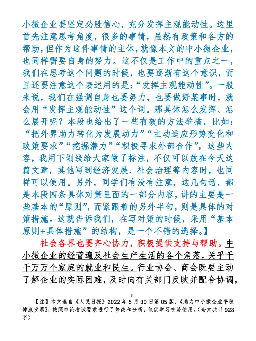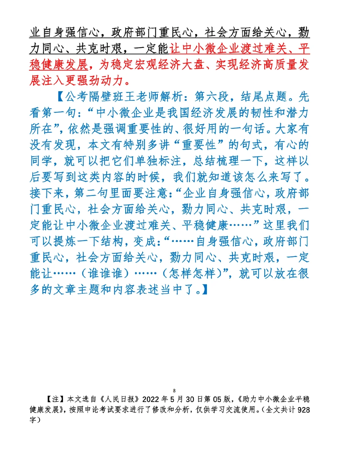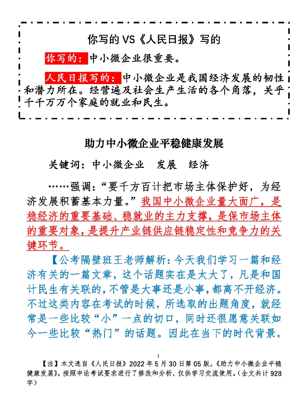 1.如何抄写:每天的抄写文章以图片形式发在“公考隔壁班王老师”账号,红色字是重点句和结构句,黑色字是正文,蓝色字是解析,大家抄写时不必抄蓝色字。建议先通读全文(包括蓝色解析部分),做到心中有数再开始抄写,效果会更好。 2.关于文章:抄写文章来源于人民日报,但每篇文章我都根据申论考试要求进行了修改,主要集中在四个方面:一是重写或修改开头、结尾;二是统一段首句句式结构;三是调整段落字数,使文章结构更均衡;四是简化复杂长难句,使之更具可模仿性。每篇文章修改幅度不同,无论修改多少,都是基于申论考试要求,毫无对人民日报文章品评之意。(此处致敬人民日报) 3.关于解析:我会在文章每段后面加一段蓝色字的解析,是我自己在抄写时的感悟,篇幅时间有限,不能面面俱到,但求重点突出。如果你有其他感悟,也希望能在评论里分享,我们相互学习、共同进步。 ⭐️ ⭐️ ⭐️ ⭐️ ⭐️ ⭐️ 这里是公考隔壁班王老师独创的“每天半小时 申论80分”抄写团,欢迎加入我们!