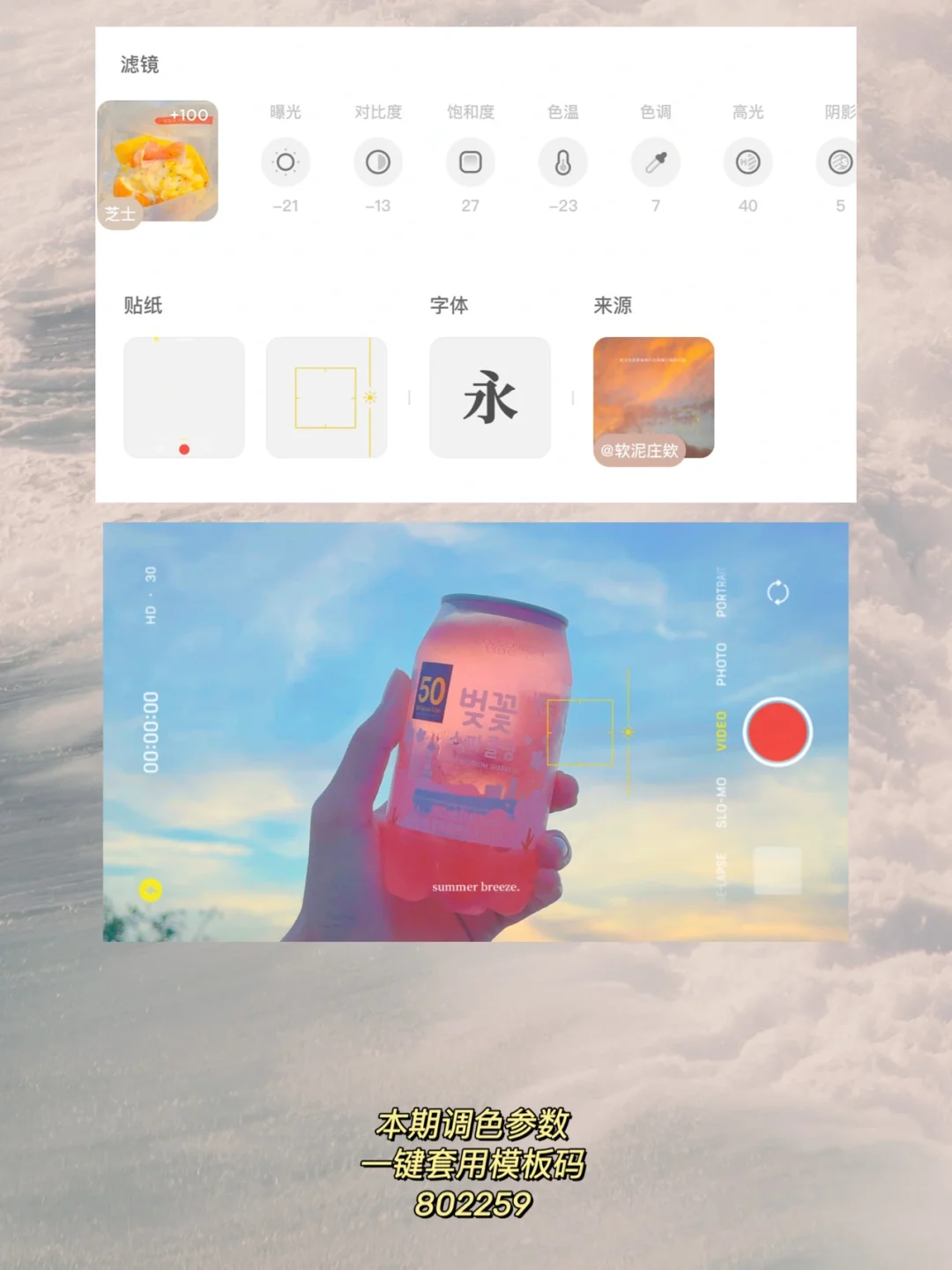 ✨日落好美~这就是属于夏天的浪漫时刻叭☁️平时的废片不用删!二次构图一下!高级感就上来啦~ . 💻 后期修图教程 黄油相机 滤镜:芝士+100 曝光-21 对比度-13 饱和度+27 色温-23 色调+7 高光+40 阴影+10 . 字体:思源宋体SemiBold 贴纸:单品贴纸—取景器 . 手机调色|调色教程|黄油滤镜调色|调色软件 | 滤镜调色教程| 拯救废片 | 手机拍照 | 手机摄影 喜欢我的分享记得👍🏻|⭐收藏|关注哦 我们下一期再见!🤍