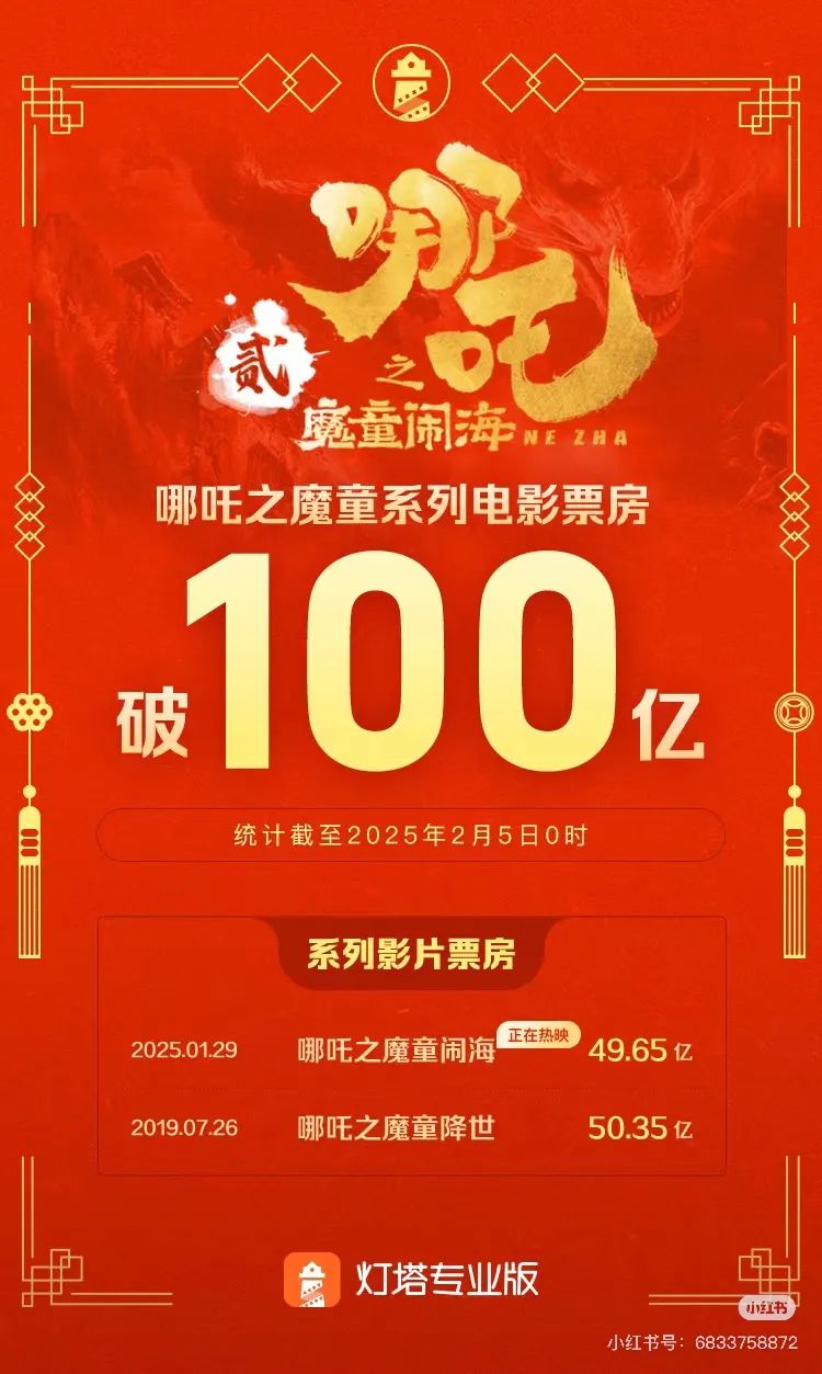 截至2月5日00:00,根据灯塔专业版数据,《哪吒之魔童闹海》实时票房超49.65亿,加上《哪吒之魔童降世》50.35亿的票房,《哪吒》系列电影总票房突破100亿,成为中国电影史上第二个百亿票房的系列IP。众望所归,接下来《哪吒之魔童闹海》有望冲击中国电影史票房的更高纪录。