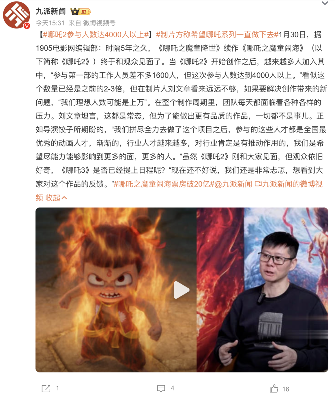 特效、故事、美术、音乐……中国动画诸多环节在大荧幕上的沧海桑田,背后是整个动画产业近年来技术的稳定进步。《哪吒2》片尾上数十家外包制作方、采访中4000人参与的团队,如此大规模的人员协调,呈现出这样完整的效果,也标志着中国动画产业工业化体系,尤其是制作流程工业化的初步形成。