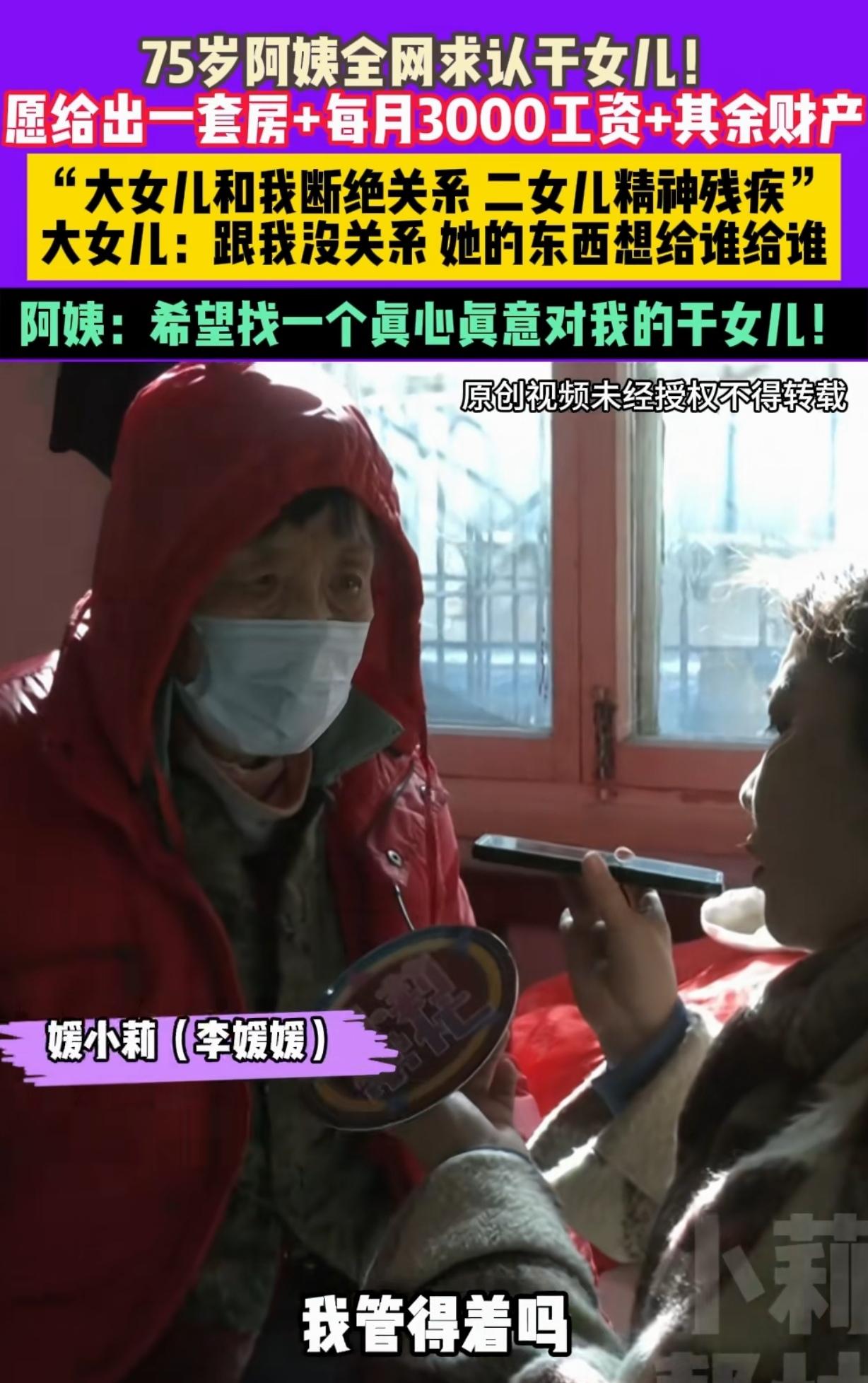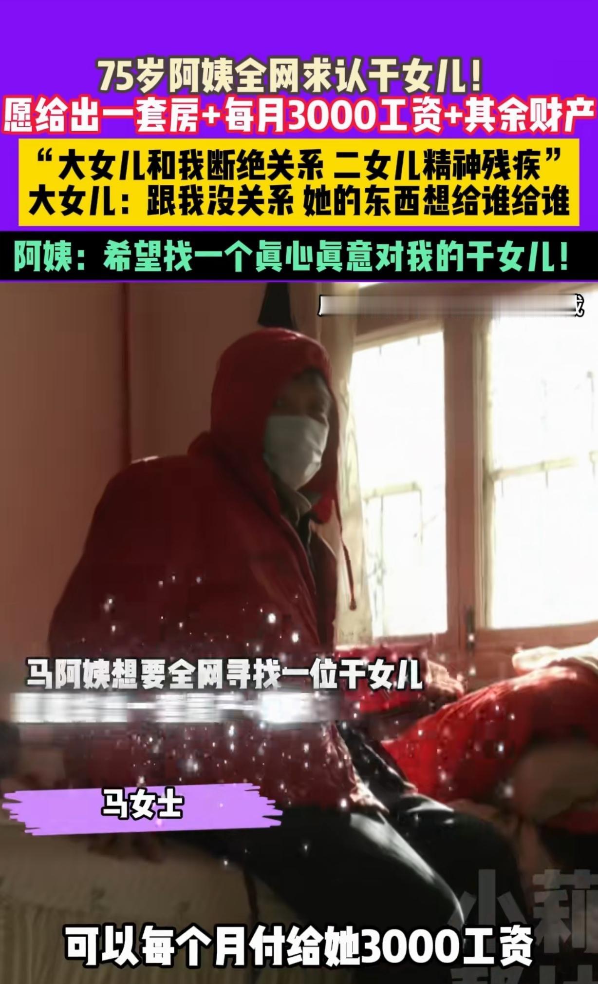 河南郑州,一75岁大妈全网求认干女儿,承诺给干女儿一套房,每月再给3000元,等她百年后,遗产也全给干女儿,只要真心对她好。大妈:大女儿跟我断绝关系了,二女儿精神残疾。大女儿:你找干女儿跟我有啥关系?你的东西愿意给谁随你便。 马大妈75岁了,2个女儿,2套房,还有退休工资,生活不愁吃喝,但却老无所依。 为了能有个依靠,她思来想去,做出一个无奈之举,她联系媒体帮忙,要全网求认一个真心对她好的干女儿。 原来,马大妈身体不好,走不了路,一日三餐也不能做,求医问药都成问题,想出去晒个太阳都是奢望,她每天被困在家里,老泪纵横。 而马大妈的大女儿,不知道什么原因,跟大妈断绝了关系,她给大女儿打电话,对方也不和她沟通,就直接挂电话,压根指望不上,让马女士痛彻心扉。 而二女儿,本身精神方面有问题,吃着低保,有固定住处,别说照顾她这个妈了,她都自顾不暇,马大妈还得为她牵肠挂肚。 一想起这两个女儿,马大妈就泪流满面,都说养儿防老,可到头来,自己却晚景凄凉。 马大妈没和记者详细说她和大女儿的恩怨纠葛,不知道她们母女之间发生了什么? 但你养我小我养你老,是我们的优良传统,母女之间,能有什么解不开的疙瘩,到了老死不相往来的地步?只能说这个大女儿也够狠心的。 马大妈自己独居,她怕有一天,自己在房间里咽气没人发现,或者走路时倒在地上,也没人扶她一把,她不想是这样的结局。 所以,马大妈深思熟虑后,决定求助于媒体,全网认个干女儿,只要求干女儿有颗善良的心,能真心对她好,她们母女相依为命。 当然了,为了回报干女儿的好,她不但给干女儿一套房,每月还给3000元,等她百年后,她住的这套房留给二女儿,除此之外,所有的财产,也都会留给干女儿。 在后继有人的情况下,马大妈能做出这样的决定,也是迫不得已,谁愿意家产旁落呢? 马大妈的家底,都是她省吃俭用积攒下来的,她又是个传统的人,百年后,把财产留给自己的孩子,在她们这个岁数的人看来,是天经地义的。 马大妈做出这样的决定,实在是无奈之举,大女儿对她冷若冰霜,不闻不问,小女儿又疾病缠身,无能为力,她只能另辟蹊径,保障自己老有所养。 不知道为什么,马大妈没有雇保姆,照顾她的饮食起居,可能怕保姆心眼不好,对她非打即骂吧。 也可能,马大妈不是真心求认干女儿,她这么做,是为了给大女儿看,让她有危机感,如果再不对母亲尽孝,她就被剥夺继承权了。 所以,记者给大女儿打去电话,万万没想到,大女儿态度坚决,也没解释为何跟母亲关系这么僵,反而态度坚决的告诉记者,她自己没工作没收入,没能力照顾母亲。 同时,大女儿表示,母亲认干女儿跟她没半毛钱关系,母亲的东西愿意给谁给谁,随她的遍。 马女士强忍悲痛,告诉大女儿,他会把另外一套房给干女儿,现住的这套,以后留给二女儿,没她的份。 不料,大女儿连说3句“随便”,然后无情的挂断电话,马大妈悲从心来,如今看来,她和大女儿的关系没有缓和的希望了,她只有认干女儿这条路可走了。 对于这对母女,为何走到这样的地步,我们不知道前因后果,也无法说谁是谁非,但肯定马大妈也有责任,有人觉得,一个连自己亲生女儿都能气的断联系的人,对外人好不了的,因为他内心自私没有爱意,管控制不住自己的女儿,想控制住干女儿。 当血缘亲情断裂,马大妈手握房产却换不来一碗女儿热汤的温度。 她的干女儿招募看似无奈之举,母女关系因长年累月的隔阂、误解或伤害而分崩离析。 但不管怎样,为人子女一定要孝顺,孝顺是刻在血脉里的责任,更是法律上的义务,哪怕与父母有千般矛盾、万般隔阂,也难掩生育之恩。 或许父母有不足,但孝顺不是盲目顺从,而是爱的包容。别等“子欲养而亲不待”才追悔,多些陪伴、多些理解,莫让亲情留下无法弥补的遗憾。 《民法典》第1067条第2款规定:成年子女不履行赡养义务的,缺乏劳动能力或者生活困难的父母,有要求成年子女给付赡养费的权利。 马大妈的大女儿明确拒绝履行赡养义务,如挂断电话、声称“没能力照顾”,而75岁的马大妈因身体无法行走、生活自理困难,且无其他可靠照料者,完全符合“缺乏劳动能力或生活困难”的法律要件。 因此,大女儿的行为已构成对法定义务的违反。 大女儿辩称“没工作没收入”不能免除其责任。但赡养义务具有强制性和平等性,子女不得以自身经济困难、父母财产分配不公或亲情矛盾为由拒绝履行。 虽然马大妈有权自由处分财产,如赠房给干女儿,但财产分配与赡养义务无法律绑定关系。 大女儿声称“母亲的东西愿给谁随便”,实际混淆了法定赡养责任与继承权利的界限。 需强调的是,即便父母通过遗嘱剥夺子女继承权,子女的赡养义务仍然存在。 马大妈可起诉大女儿履行义务,如果她仍拒不执行,法院可采取强制执行措施。 关注@灋律盐究员 学法辩是非,用法止纷争。