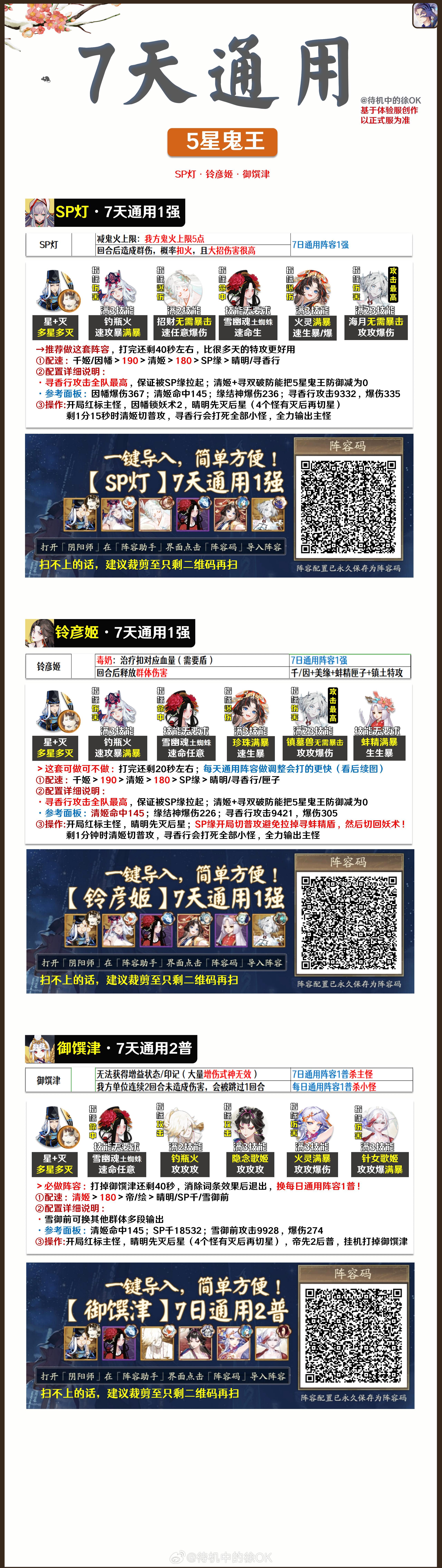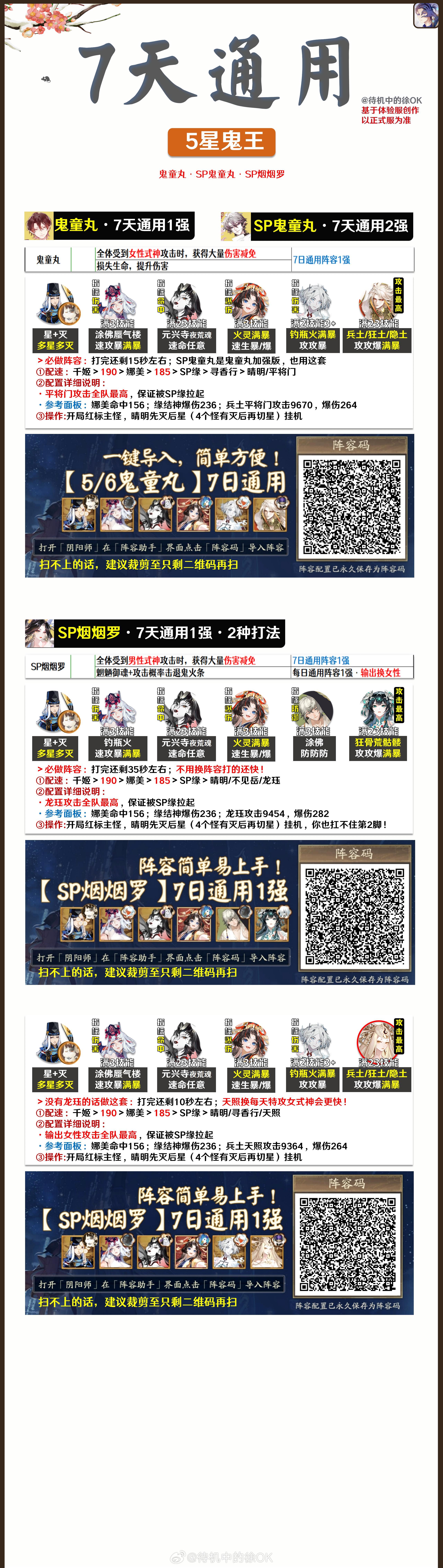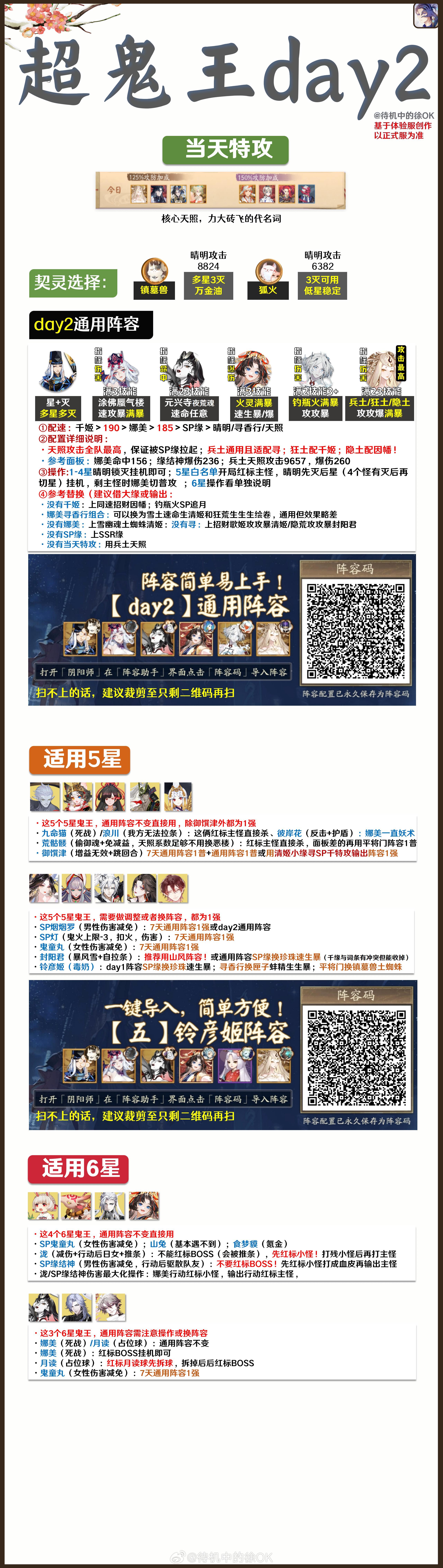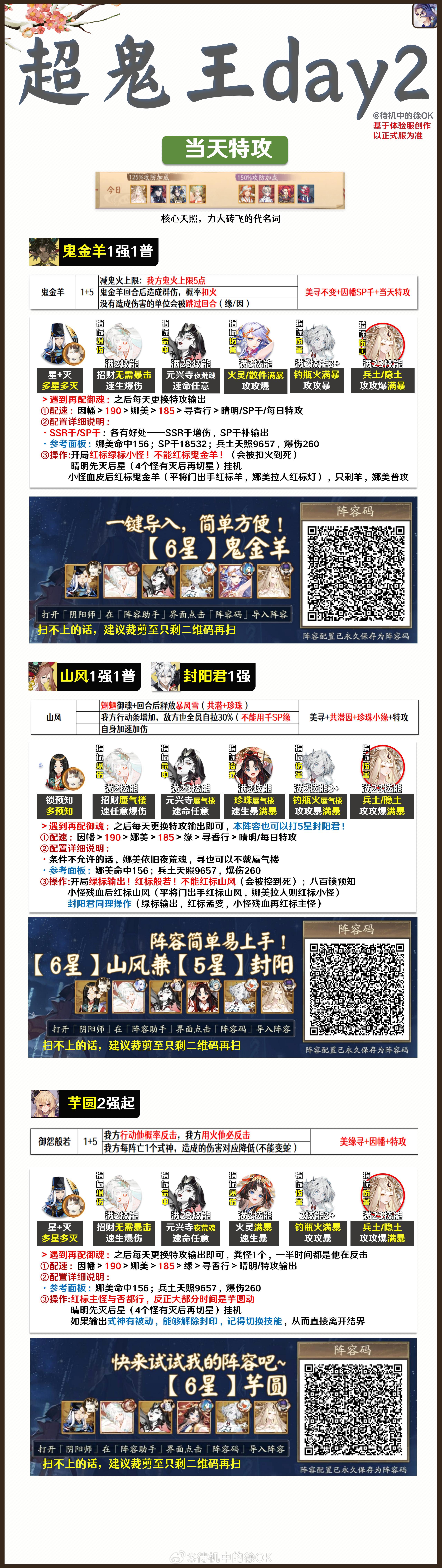 【超鬼王day2•全攻略】早上好啊宝宝们✦新增1套SP烟烟罗7日通用阵容,1强能剩35秒✦同理应该能打SP缘,但我今天没遇到✦SP灯•铃彦姬•御馔津日通用阵容✦SSR/SP鬼童丸•SP烟7日通用阵容✦平将门•SP岳7日通用阵容✦day2阵容汇总【文字码】day2通用:|TA|056aa1dcb4063be6d4f3a82e5e28607dSP灯7天通用:|TA|59763c692c60687a1bf38f8e98251c3c铃彦姬7天通用:|TA|31b5f913de31cdf0d1ed5bca785c8167SP烟7天通用①:|TA|ee11a4a9337d4f68625a657284e369e0SP烟7天通用②:|TA|1afc94447e045a6c6fa0b491b50c54c1大小鬼童丸7天通用:|TA|9d0e54659f5329e41da23b884d5fb549御馔津7天通用:|TA|72afae958f80c3426247765bff3263cb平将门7天通用①:|TA|70babb0a0ce5f0afa8832cef52849647平将门7天通用②:|TA|b294c7450818b0567673ee1269d0a568SP岳7天通用:|TA|67367c309b503aebbf0f41fe37fc46ed【文字码】铃彦姬:|TA|0965350f4c7911ed0b99b0cea392e83f鬼金羊:|TA|361238ad38e32c2069ed912542450dfc山风兼封阳君:|TA|ce71d18bef0615129e5fcd57afbf4268芋圆:|TA|181ed8f0943a021f53df5a643639c704✦我自己的日清打完了,晚点收些鬼王试阵容