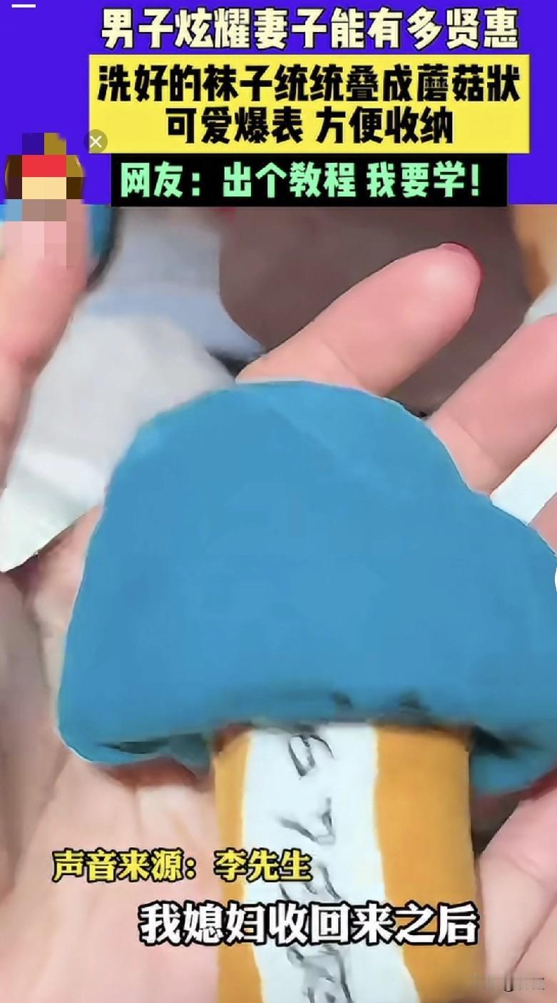 娶一个这样的媳妇真是捡到宝了。 11月16日,河南郑州的李先生发布视频说她媳妇将洗完晾干的袜子收了起来,叠好。 叠成的蘑菇形让李先生哈哈大笑,表示太可爱了。 确实是太可爱了,能将袜子叠成如此可爱的形状,试想这个媳妇的灵魂不知道有多可爱呢。 千里马也需遇见伯乐,关键人家老公还善于发现老婆的可爱之处,看来老公更可爱。 这样的两个人一起组建的家庭才更稳固吧。 可见遇上一个不扫兴的另一伴有多重要。