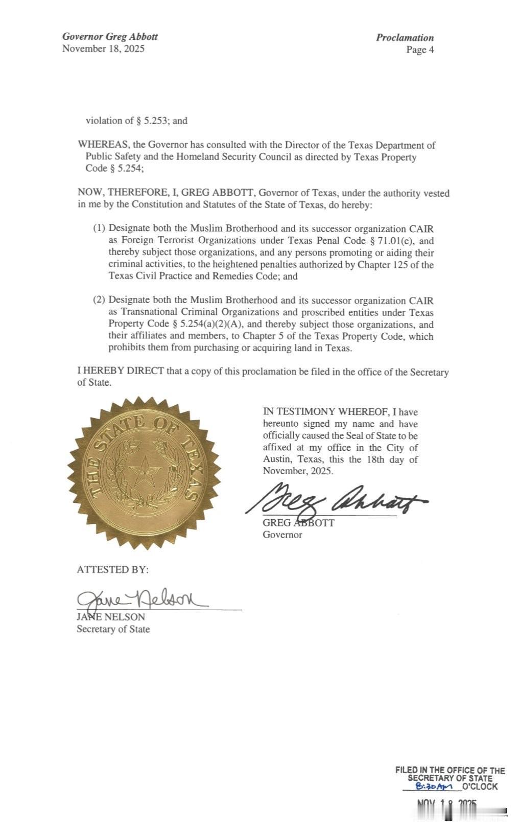昨天,美国得克萨斯州州长格雷格·阿博特(Greg Abbott)宣布“穆斯林兄弟